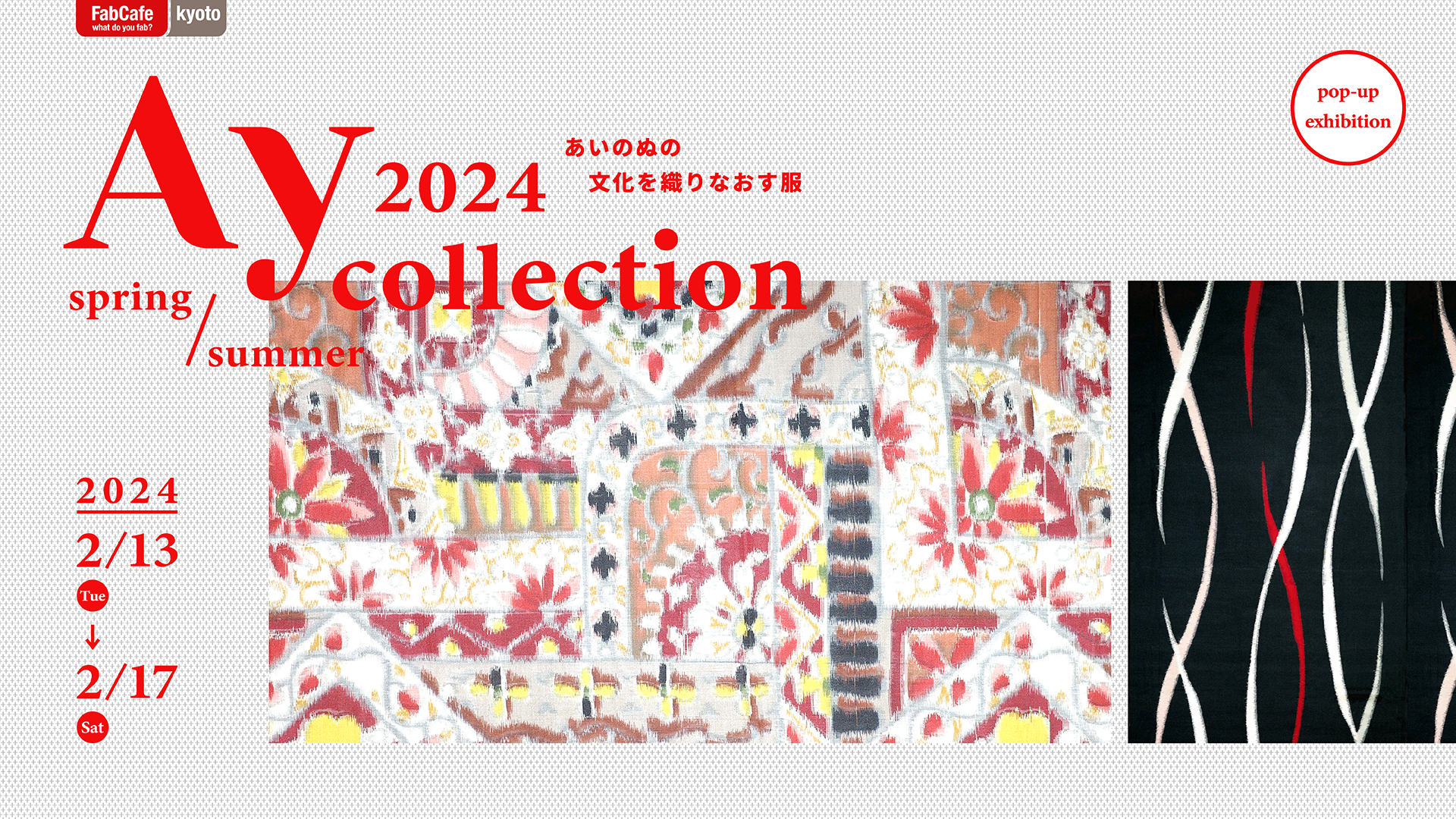 "文化を織りなおす"をミッションにかかげるカルチャーブランド「Ay」による、群馬県の伝統的な絹織物「伊勢崎銘仙」からインスピレーションを得て、現代技術でオリジナルテキスタイルとして再構築し衣服に仕立てた「あいのぬの」コレクションの展示受注/販売を行います。(主催:Ay / 協力:群馬県・株式会社ロフトワーク)