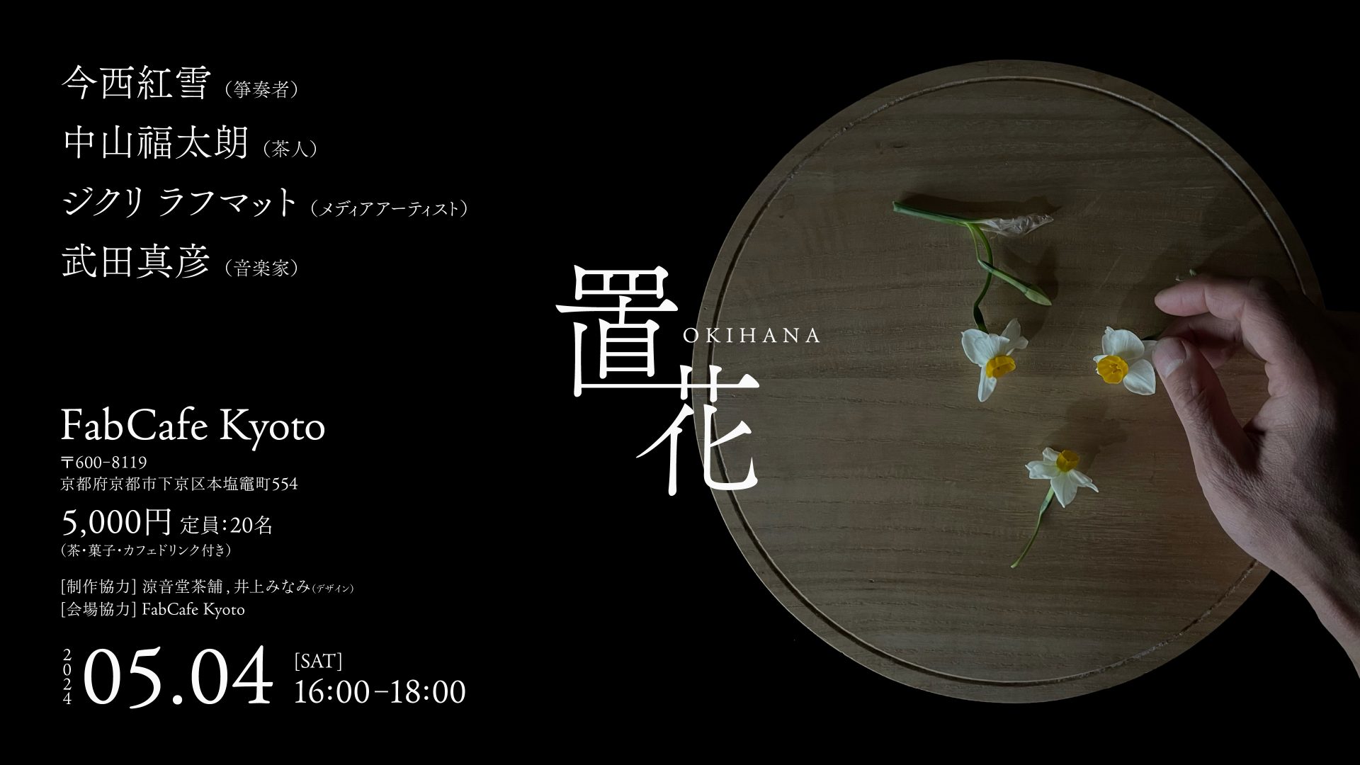 茶・音楽・プログラミングによる特別な茶会「置花」を5月4日(土)に開催。茶の湯と作曲に共通する「配置」の美学に着目し、互いの空間・時間に対する感覚を、それぞれの手段を越えて響き合わせることを試みます。【出演:今西紅雪(箏奏者・音楽家)中山福太朗(茶人)ジクリ ラフマット(メディアアーティスト)武田真彦(音楽家)/協力:涼音堂茶舗/デザイン:井上みなみ/会場協力:FabCafe Kyoto】