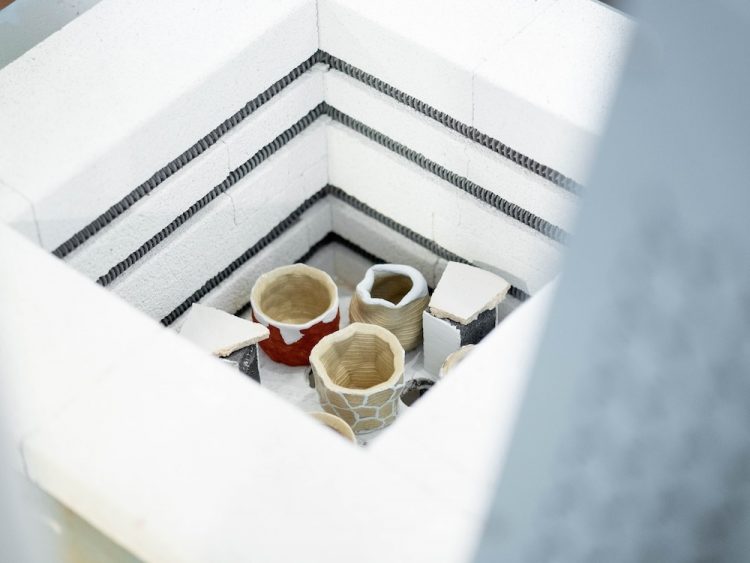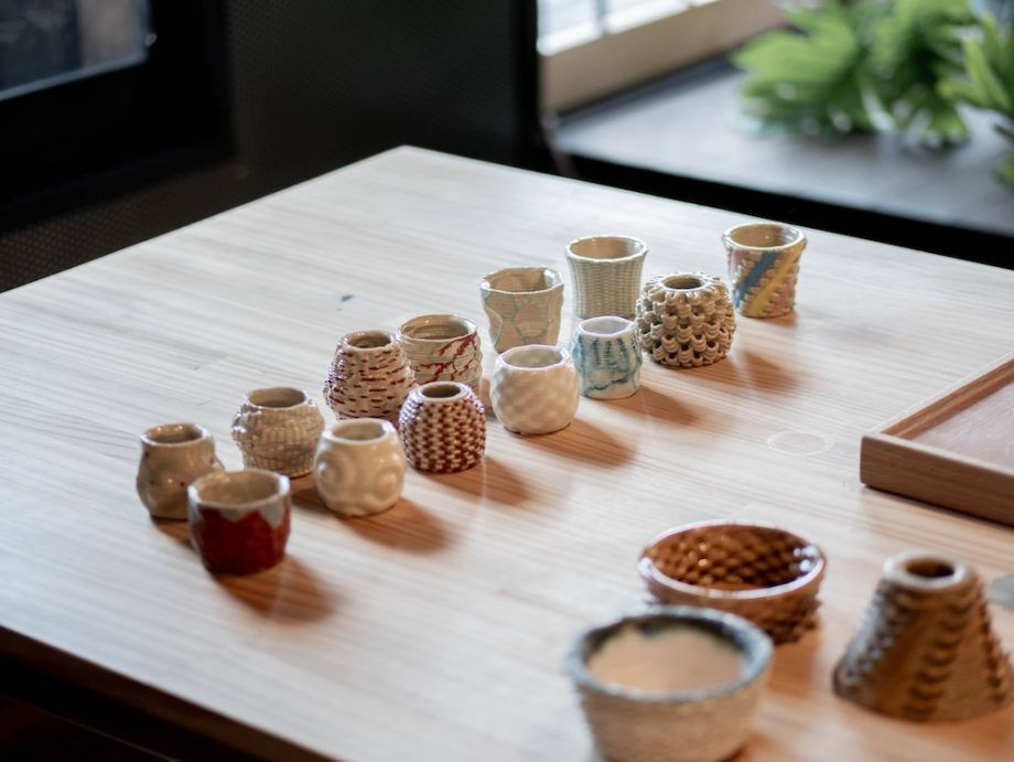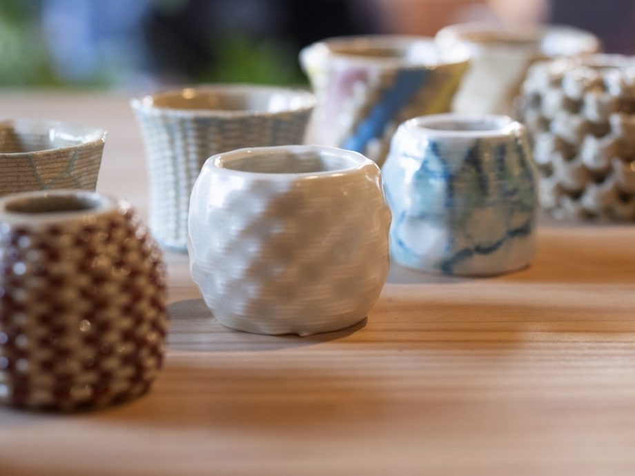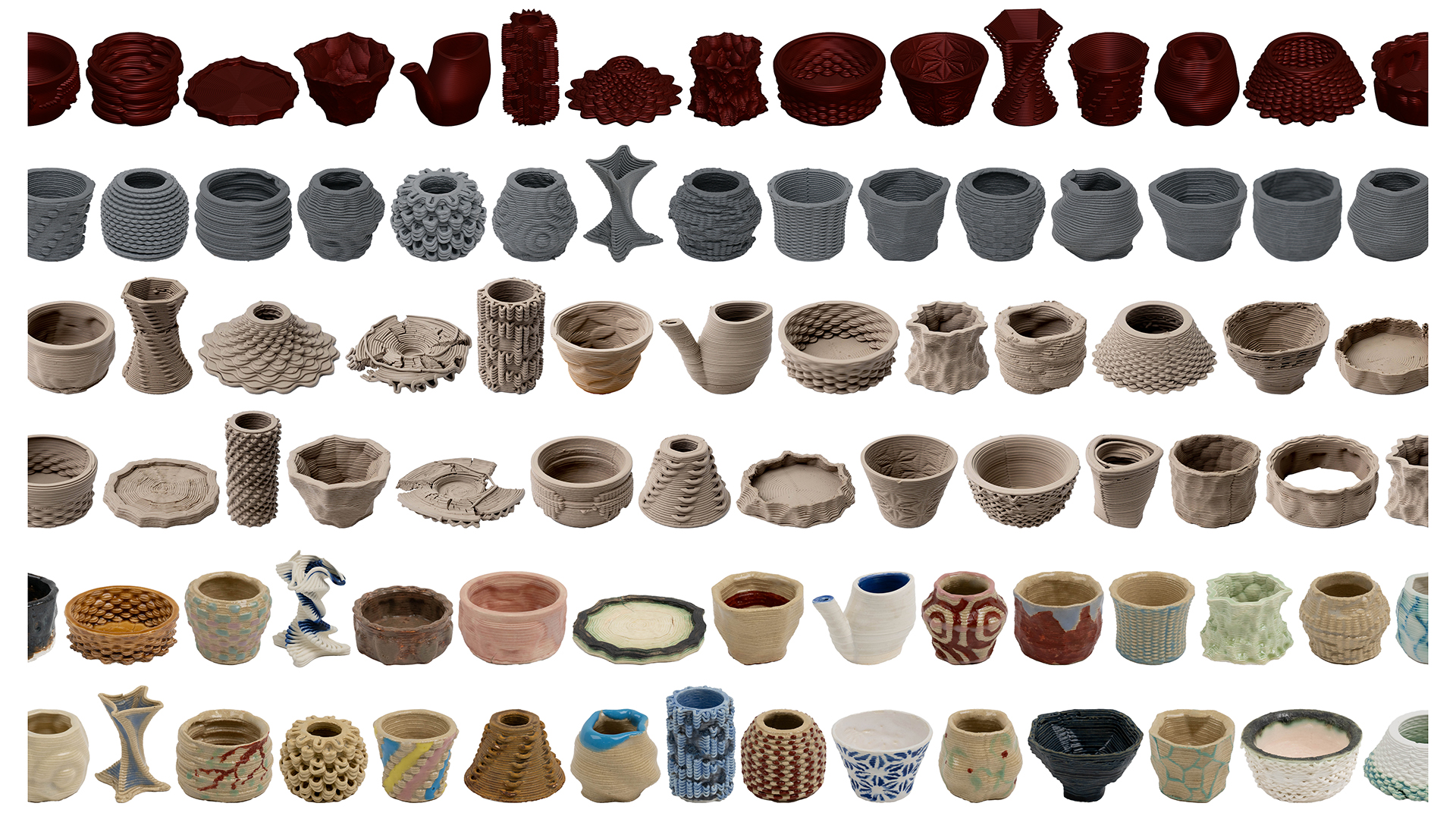すべての作品は、各受講者がそれぞれに「Houdini」を用いて3D形状の設計を行い、3Dプリンタで出力したのち、自身で調合した釉薬をかけたうえで焼成されています。(*すべて非売品です。会場での販売は行いませんので、あらかじめご了承ください。)
