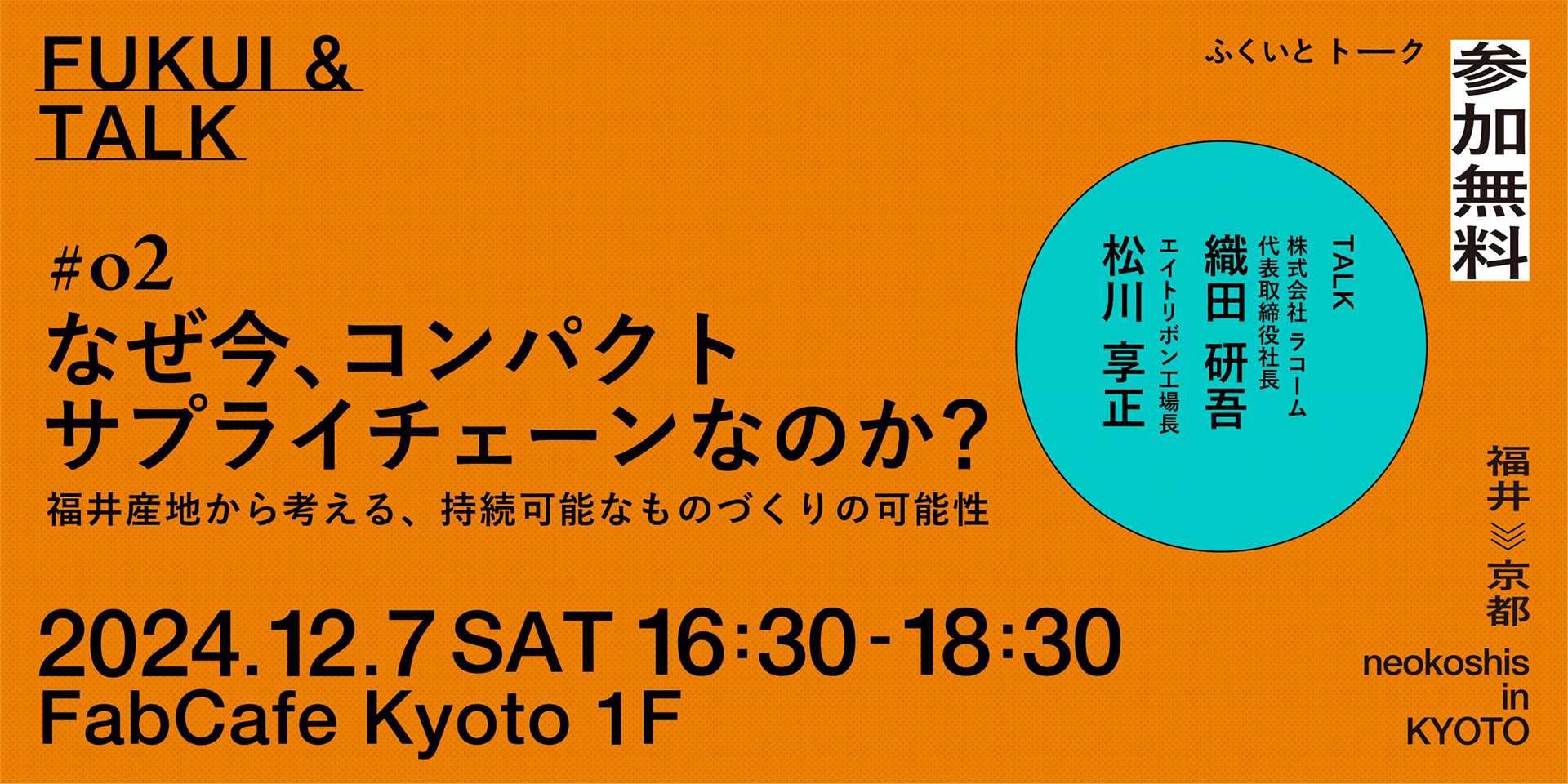 福井県の衣食住を各地で伝える全3回のトークイベントシリーズ「ふくいと -Fukui&-」。第2回は京都で開催予定です。「持続可能なものづくりの可能性」「コンパクトサプライチェーン」をテーマに、実際に福井の産地で活動する二人のゲストをお招きします。(主催:ねおこしズ、会場協力:FabCafe Kyoto)
