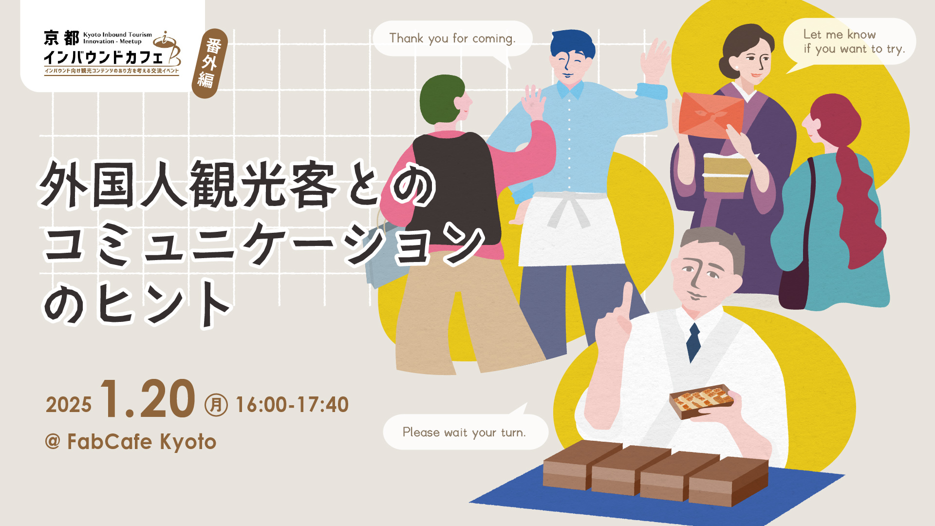 番外編となる今回は、FabCafe Kyotoを会場として、外国人観光客とのコミュニケーションについて考えます。京都市、京都市観光協会とロフトワークが観光事業者向けに制作した『コミュニケーションフレーズ集』をご紹介し、明日から使っていただけるような活用例や、京都市認定通訳ガイド(京都市ビジターズホスト)を交えて現場で役立つフレーズをお伝えします。