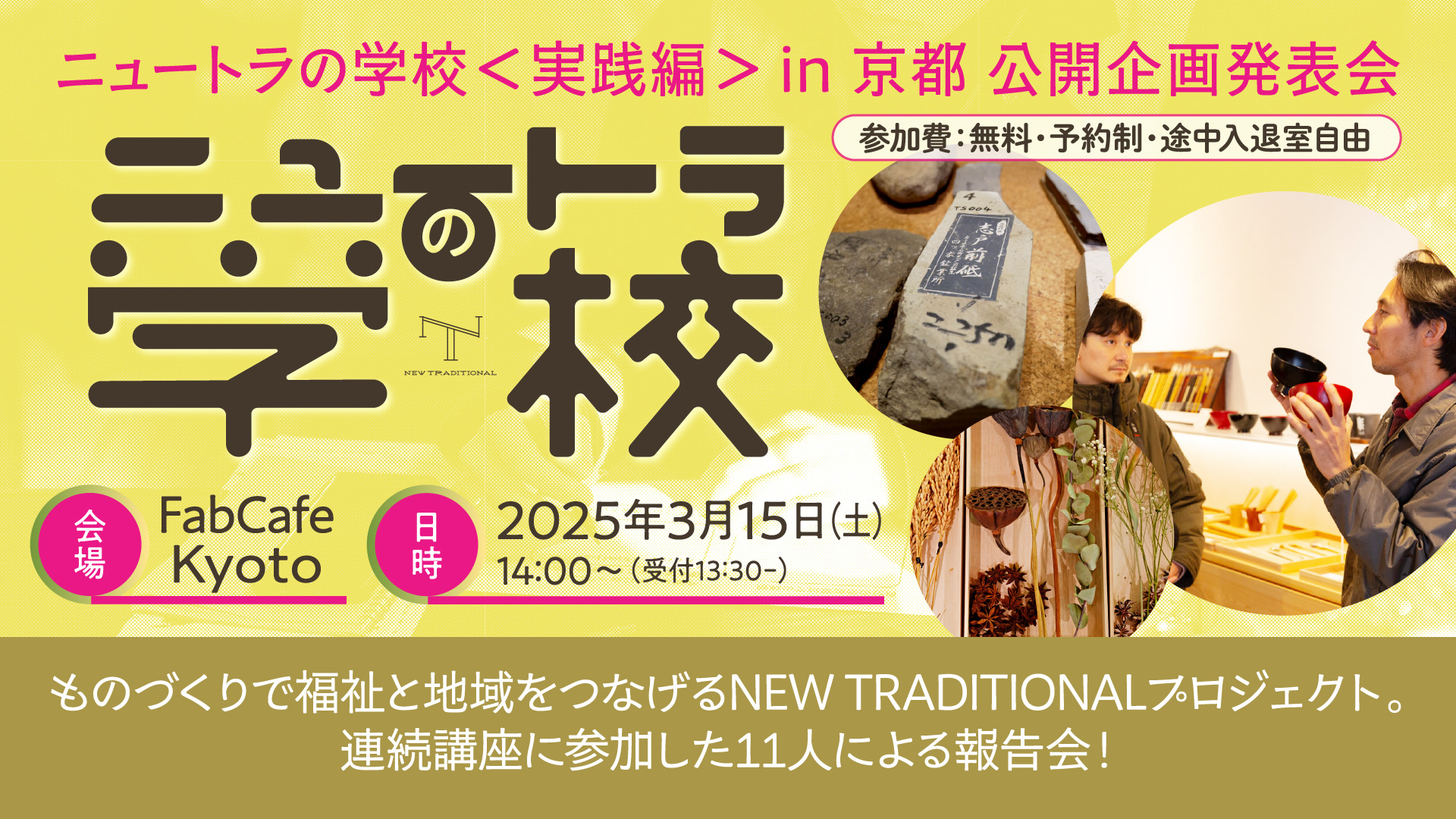 NEW TRADITIONAL(通称:ニュートラ)は障害のある人とともに、伝統のものづくりをとおして新しいものづくりのありかたや、それらが息づく生活文化を提案するプロジェクトです。「ニュートラの学校」は福祉・ものづくり・デザインといった分野をつなぐ人材育成をめざしているプログラムです。この度、地域やものづくりのニーズを読み込むリサーチ方法を実践的に学び、「多様な人が体験・参加することのできるワークショップやツアーなどの企画」を立案しましたので、公開で発表いたします。(主催:一般財団法人たんぽぽの家、協力:FabCafe Kyoto)