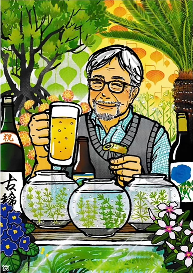 2024年に70歳になった私のために昔の教え子達からプレゼントされた、ウチダヒロコさんが書いてくれた似顔絵と私が研究に使用してきた実験材料としての植物たち。