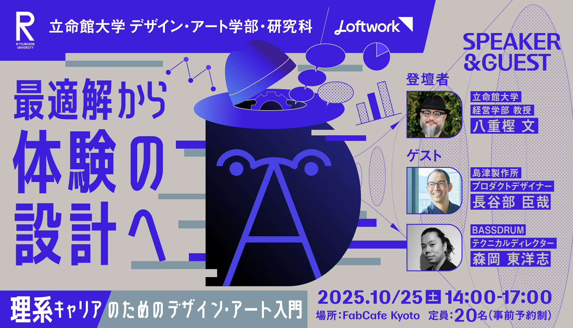 理系こそデザインを学ぼう。「良いものをつくったのに社会に届かない」という課題・悩みを突破する「体験設計」の学びに触れるトーク&ワークショップを無料開催します。自身のキャリアの可能性を拡張したい理系職の方はもちろん、中高生の進路指導に携わる教員や保護者の方もぜひお越しください。(共催:立命館大学 デザイン・アート学部・立命館大学 大学院 デザイン・アート学研究科 / 株式会社ロフトワーク)
