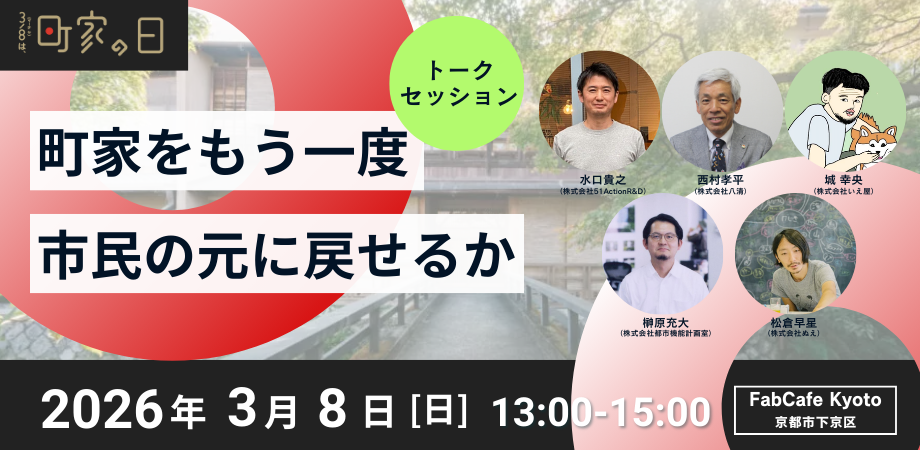 毎年3月8日は「町家の日」。その前後一週間を「町家Week」として、京都を中心に、日本全国で町家を舞台にした様々なイベントが開催されます。FabCafe Kyotoを会場にした本トークでは、「市民の手から離れてしまった京町家をどうやったら元に戻せるのか」という問いについて有識者・実践者による議論が展開されます。(主催:町屋の日 / 協力:FabCafe Kyoto)
