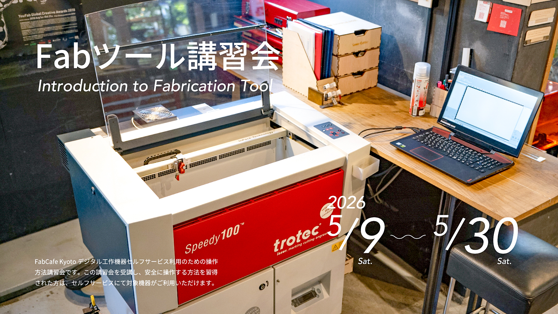 FabCafe Kyotoデジタル工作機器セルフサービス利用のための操作方法講習会です。この講習会を受講し、安全に操作する方法を習得された方は、セルフサービスにて対象機器がご利用いただけます。