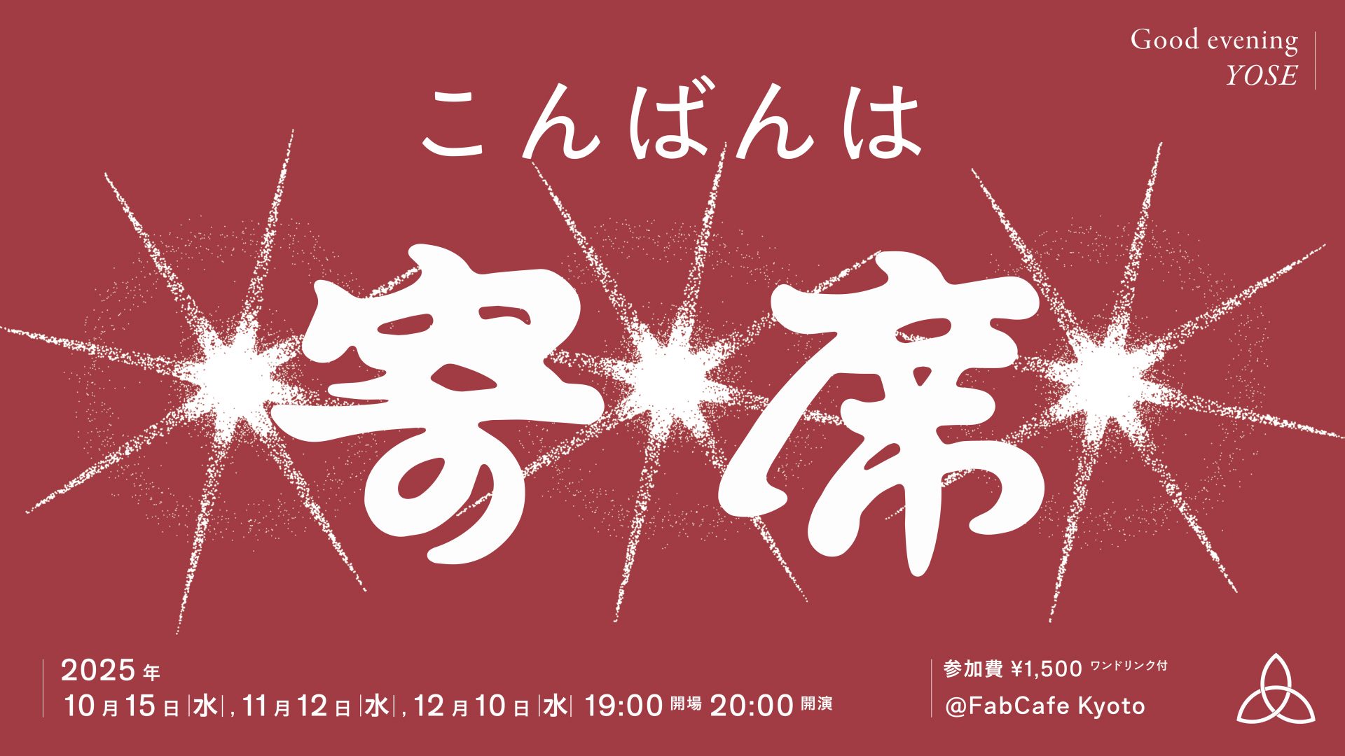 江戸時代、上方や江戸では各町内に一つの寄席小屋があり、身近なエンタメであると同時に町内コミュニケーションの要として機能していました。そんな古来の寄席機能を再考し、仕事帰りや学校帰りにフラっと立ち寄って落語を楽しむ「こんばんは寄席」を企画しました。座布団を置けばそこは寄席小屋。FabCafe Kyotoを起点に様々な町へ出向きます。