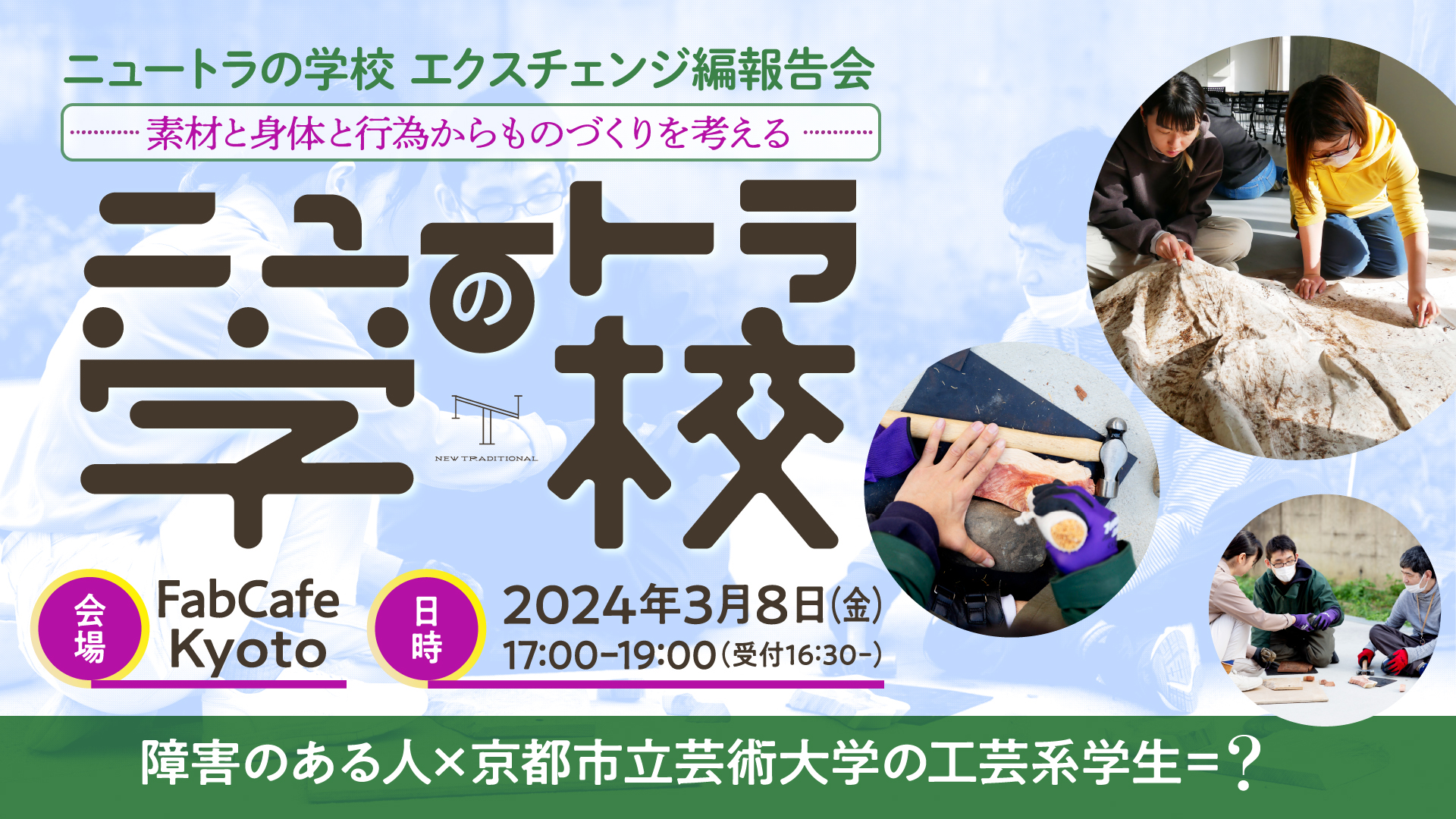 「アート」と「ケア」の視点から、さまざまな事業を実施しているたんぽぽの家は、「ニュートラの学校」と題し、福祉と伝統のものづくりを結び直す取組みをおこなっています。本イベントは、その一部であり、京都市立芸術大学と連携したエクスチェンジプログラムの報告会です。工芸を学ぶ学生や教員、障害のある人や施設職員らが、互いの創作の現場を行き来しながら、ものづくりを通して交流しました。その過程や成果物を紹介します。