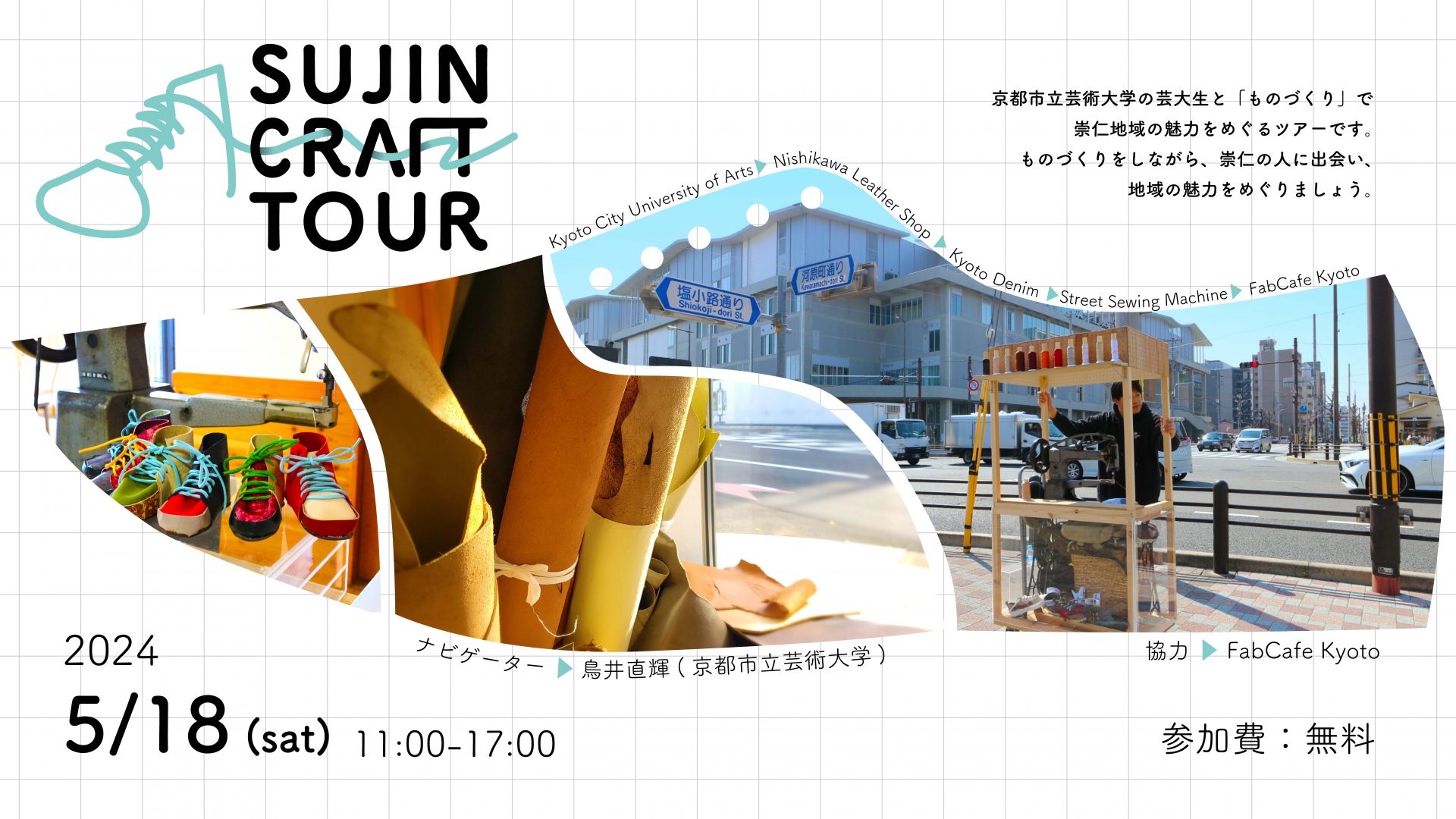 本イベントは、昨年10月に移転した京都市立芸術大学の学生による、崇仁地域の魅力を「ものづくり」を通じて知ってもらうための街歩きツアーです。このツアーでは、崇仁地域のものづくりに関する場所をめぐりながら、この地域の伝統産業である革素材を集めます。全ての場所で革のパーツを集めると、ツアーの参加記念として革靴のミニチュアを作ることができます。ものづくりをしながら、崇仁の人に出会い、地域の魅力をめぐりましょう!また、拠点となるFabCafe Kyotoでは、崇仁地域にまつわるものづくりの展示や当日のツアー中継などを行います。(主催:鳥井直輝 会場協力:FabCafe Kyoto)