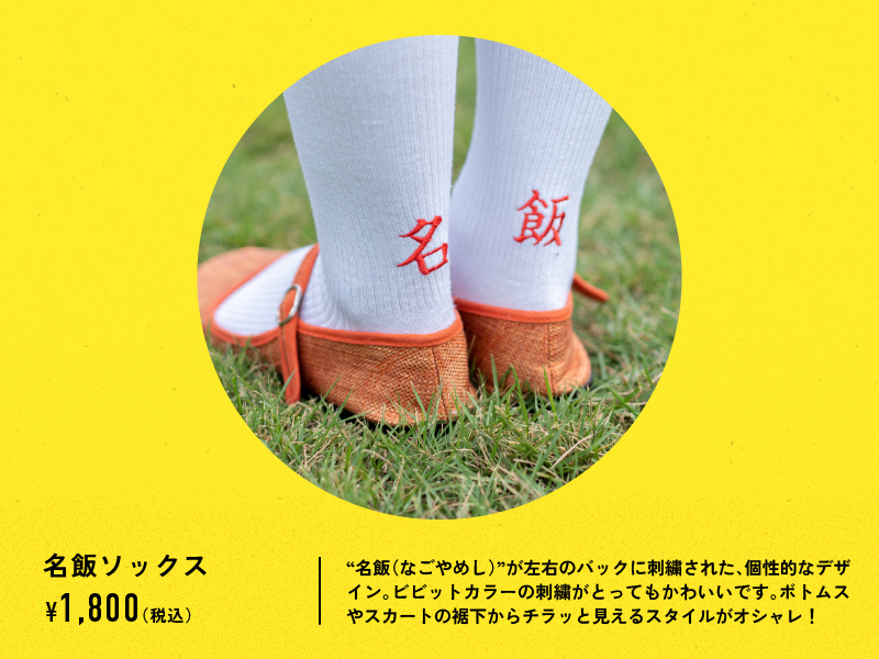 “名飯(なごやめし)”が左右のバックに刺繍された、個性的なデザイン。ビビットカラーの刺繍がとってもかわいいです!ボトムスやスカートの裾下からチラ見せさせるといい感じ◎