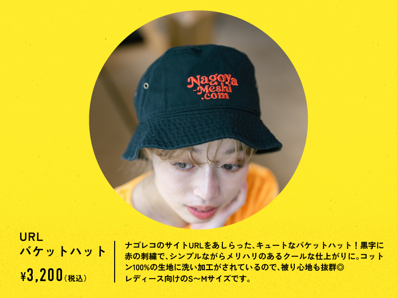 ナゴレコのサイトURLをあしらった、キュートなバケットハット!黒字に赤色の刺繍で、シンプルながらメリハリのあるクールな仕上がりに。コットン100%の生地に洗い加工がされているので、被り心地も抜群です◎