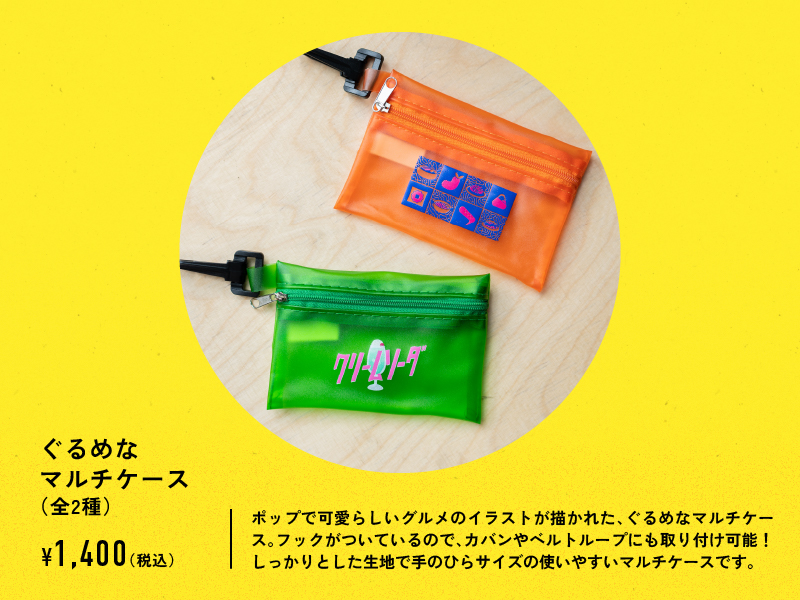 ポップで可愛らしいグルメのイラストが描かれたデザイン。フックがついているので、カバンやベルトループにも取り付け可能◎