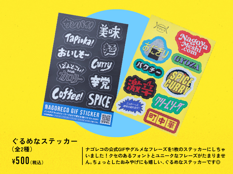 ナゴレコの公式GIFやグルメなフレーズが、1枚のステッカーに大集結!クセのあるフォントとユニークなフレーズがたまりません。ちょっとしたおみやげにも嬉しい、ぐるめなステッカーです◎