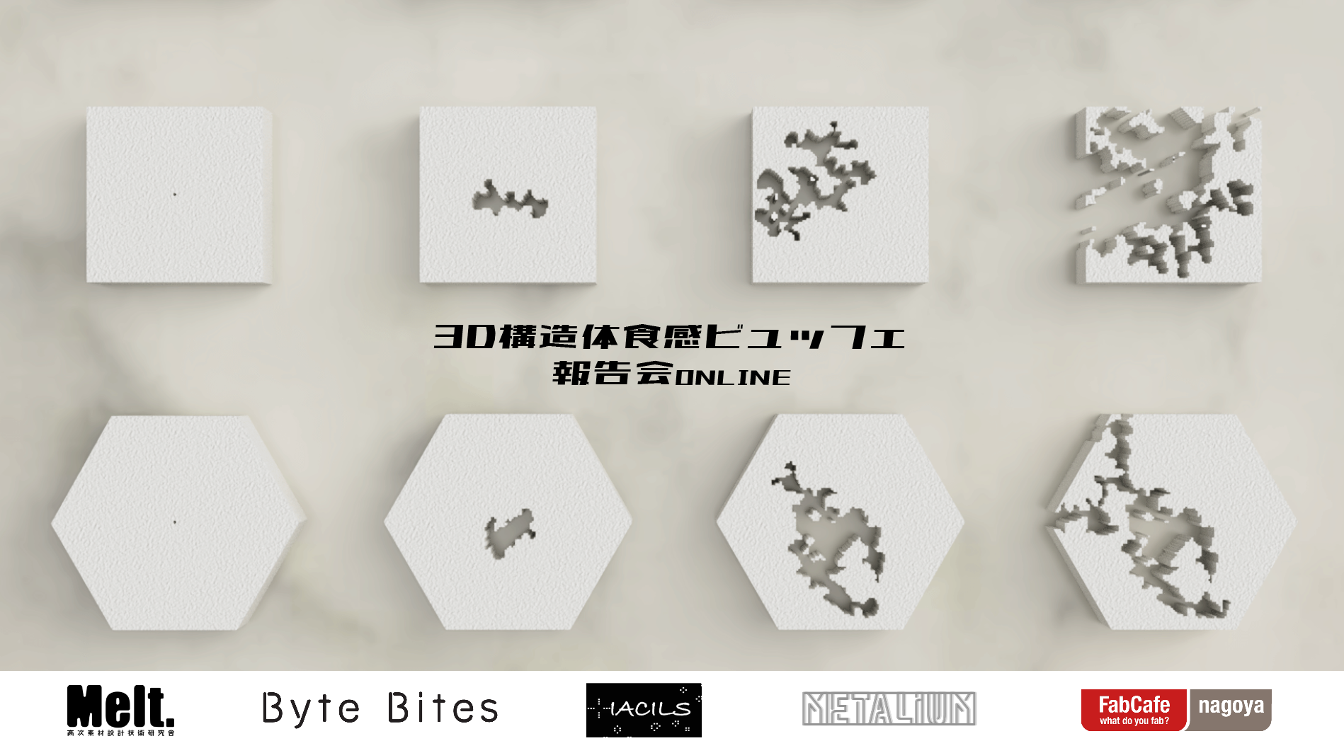 私達はコンピュテーショナルに食感を生み出すことを目指して、約一年かけて議論と実験を重ねてまいりました。その過程で生まれた様々な構造体たちを、3Dフードプリント技術を使い食べられる構造体としてみなさまにご提供いたします。私達の一年間の成果を食感のビュッフェとしてお楽しみください。