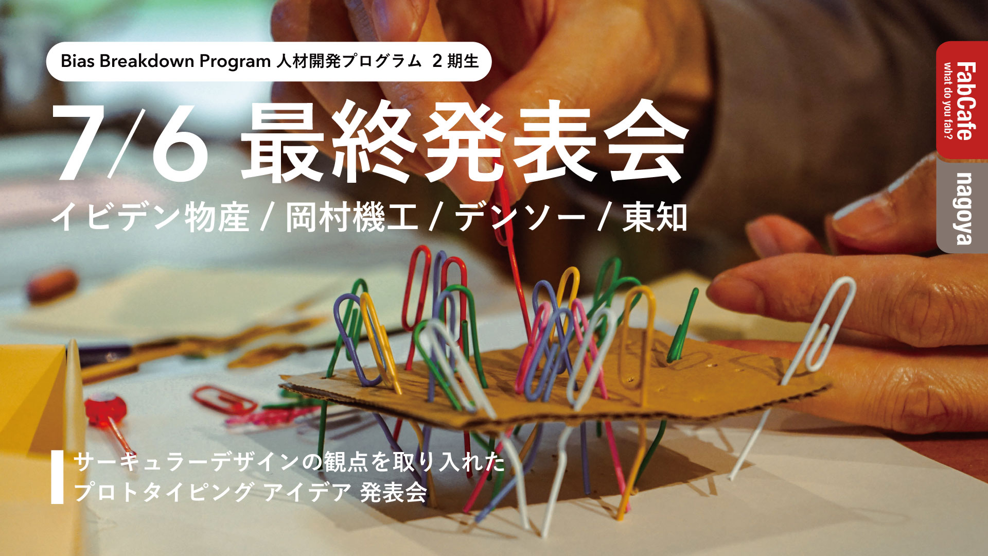 プロトタイピング、フィールドリサーチ、インタビューなど、数々のワークを通してクリエイティブな思考や態度を学んできた『バイアスを破壊する 人材開発プログラム(BBPG) 』二期参加の各社が、”サーキュラー・エコノミー”の観点を取り入れ、自社の一歩目を本気で考えた、1日だけのプロトタイプ発表会を開催いたします。