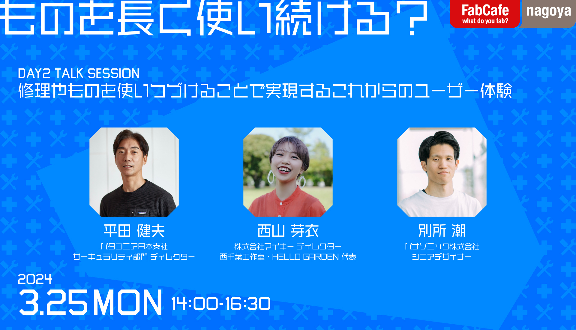 私たちは身近にあるものとの向き合い方を、改めて考え直すトークイベント。ものを「使い続ける」ことにまつわるアプローチに取り組んでいる、Patagonia.inc サーキュラリティ部門の平田健夫、西千葉工作室代表の西山芽衣、パナソニック(株)シニアデザイナーの別所潮をゲストに迎え、これからの暮らしにおけるものとの向き合い方について、トークセッションを行います。