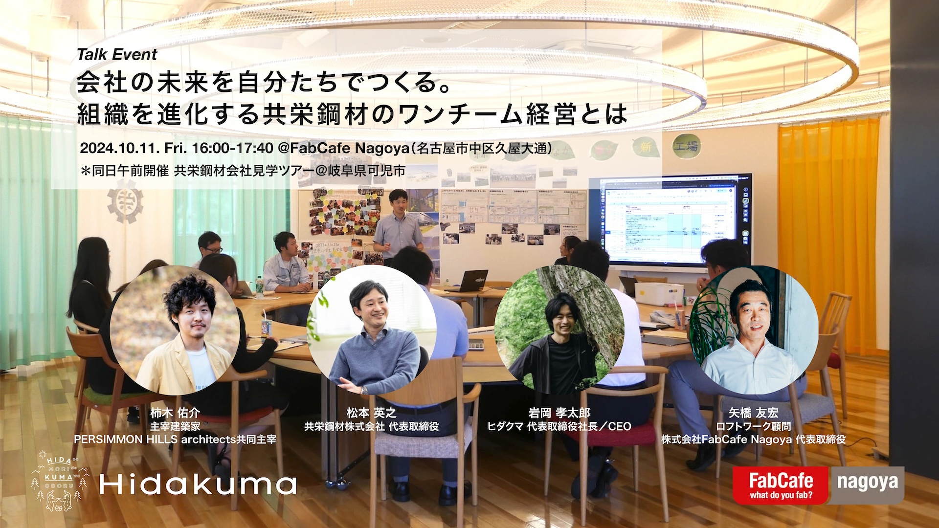 イベントでは、ともにつくるプロセスの中で、社員や自社に関わる人々の思いを信じ、未来構想プロジェクトを推進する共栄鋼材の松本代表から、同社が大切にする縁をつなぐチームビルディング、社内外の交流を促進する場づくり、クリエイティブの意義などについて語っていただきます。登壇するのは、継続してプロジェクトに関わる建築家の柿木さん・ヒダクマの岩岡と、本プロジェクトの初期に関わっているFabCafe Nagoyaの矢橋さんです。