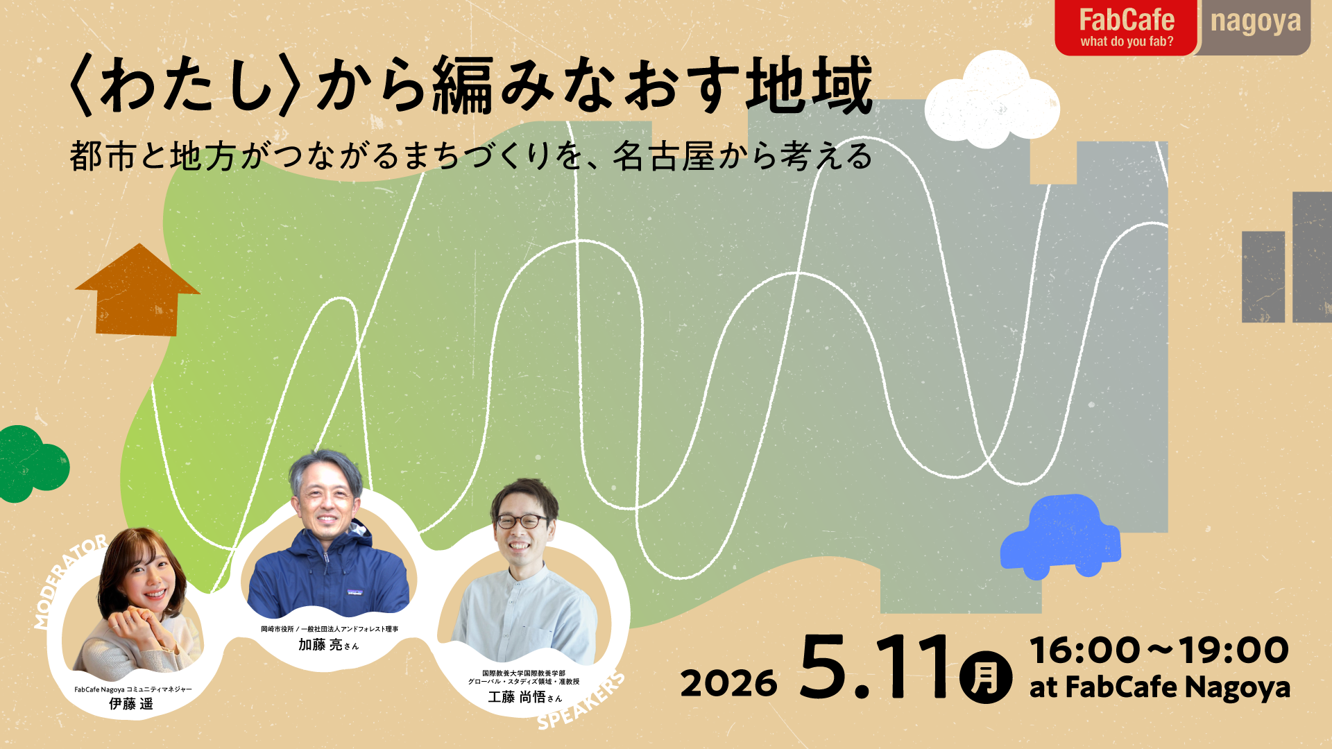 FabCafe Nagoyaではこの春、「つなぐ」をテーマに、産業、地域、学びをめぐる複数のイベントや展示を展開しています。「会社を継ぐ、産業をつなぐ」「暮らし・文化・産業を、未来につなぐ」といった企画に続く本イベントは、その流れのなかで、都市と地方の関係をあらためて問い直す対話の場です。工藤尚悟さんのご著書を起点に、岡崎の森とまちをつなぐ実践者・加藤亮さんを迎え、名古屋から地域との新しい関わり方をひらきます。