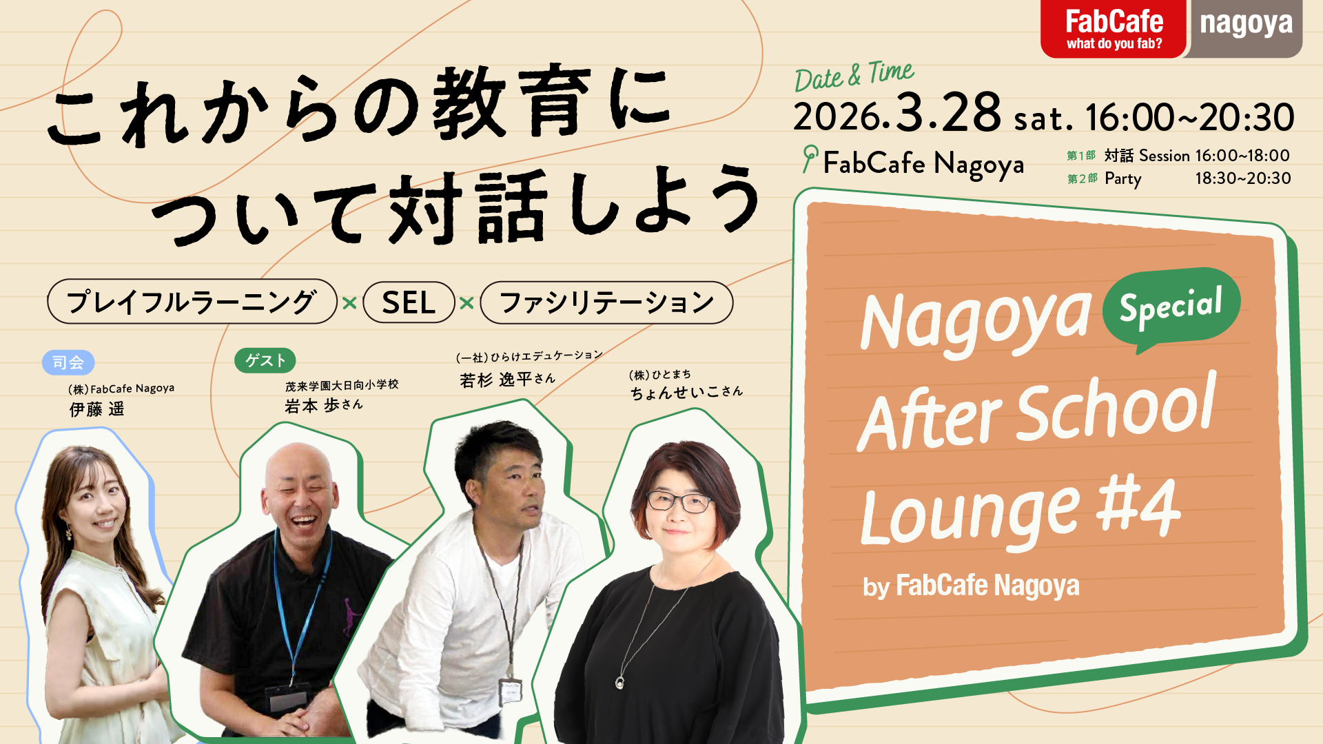 教育に関する多彩なゲストとともに、教育に関心をもつ仲間とゆるやかにつながる対話と創造の場「Nagoya After School Lounge」。第4回のテーマは「これからの教育について対話しよう〜プレイフルラーニング× SEL×ファシリテーション〜」。今年度の3名のゲストをお招きした土曜開催&Partyつきスペシャルバージョンでお届けします。