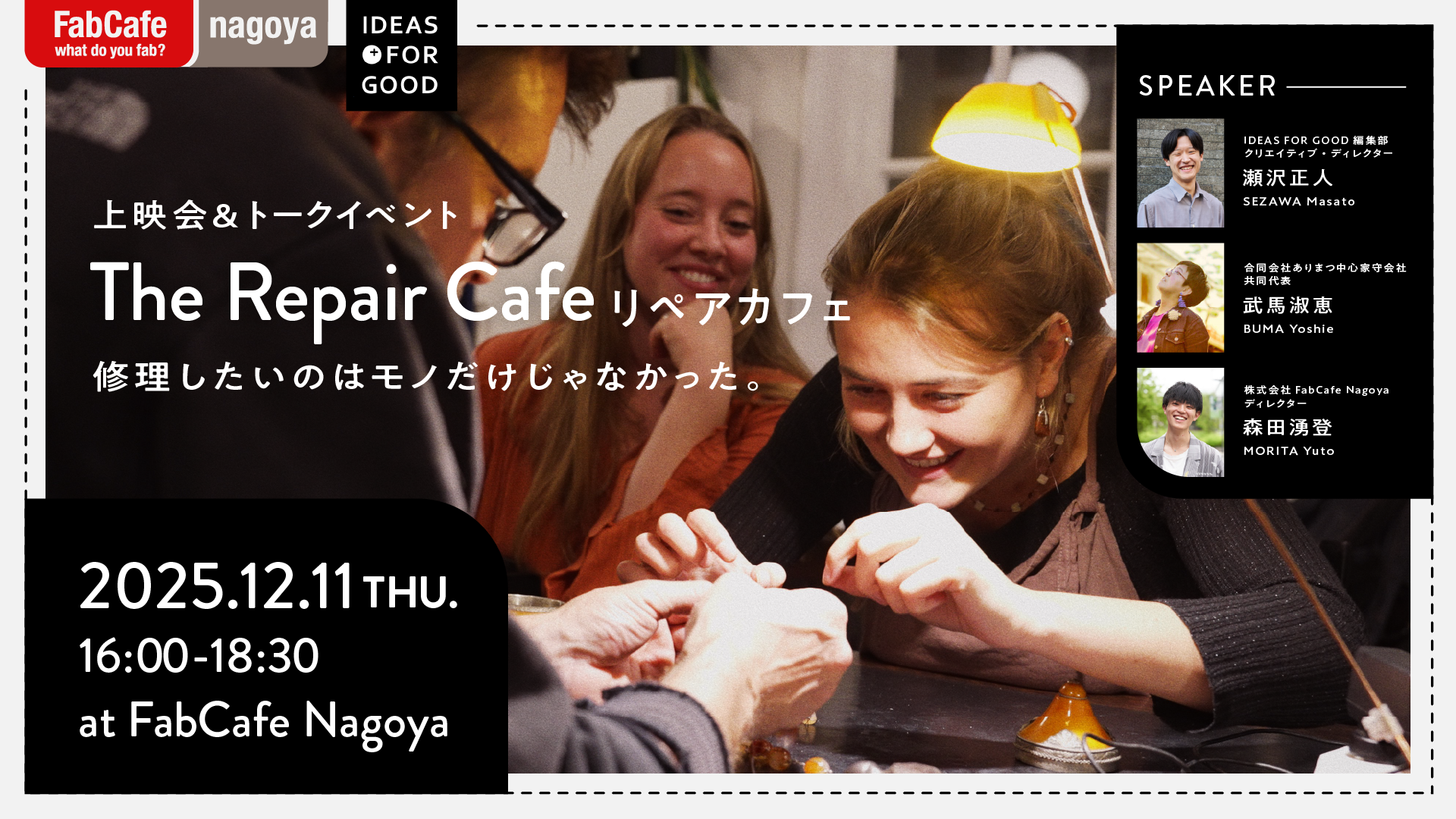 IDEAS FOR GOODが贈る、オリジナルショートドキュメンタリー『リペアカフェ』の上映会を開催します。オランダ・アムステルダムを舞台に壊れたモノを無料で修理する活動を通じ、モノとの関係性や地域の繋がり、消費社会のシステムまで見つめ直すドキュメンタリー。上映後は、作品ディレクターの瀬沢さんと、有松でまちづくりに取り組む武馬さんを迎え、このグローバルな思想をどう「私たちのまち」に根付かせることができるかを深掘りします。