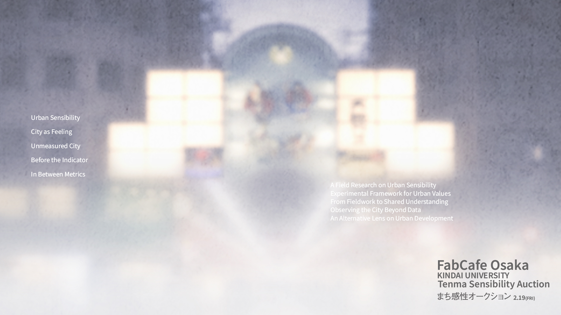 今回は、そのプロセスから生まれた「天満の感性指標」を発表し、未来のまちづくりを考えるイベントを開催します。まちの感性を“味わう”、そんな新体験をご用意してお待ちしています。