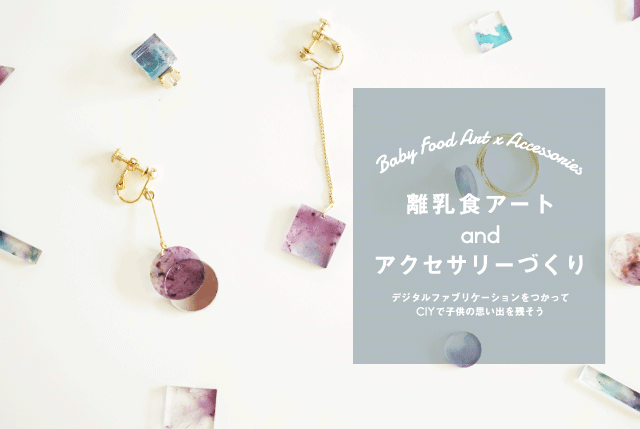オリジナルの絵がプリントされたパーツを使って世界に一つだけのアクセサリーを作ることができます。デザインは、ピアス・イヤリング・指輪・ブローチの4種類のサンプルの中からお選び頂けます。