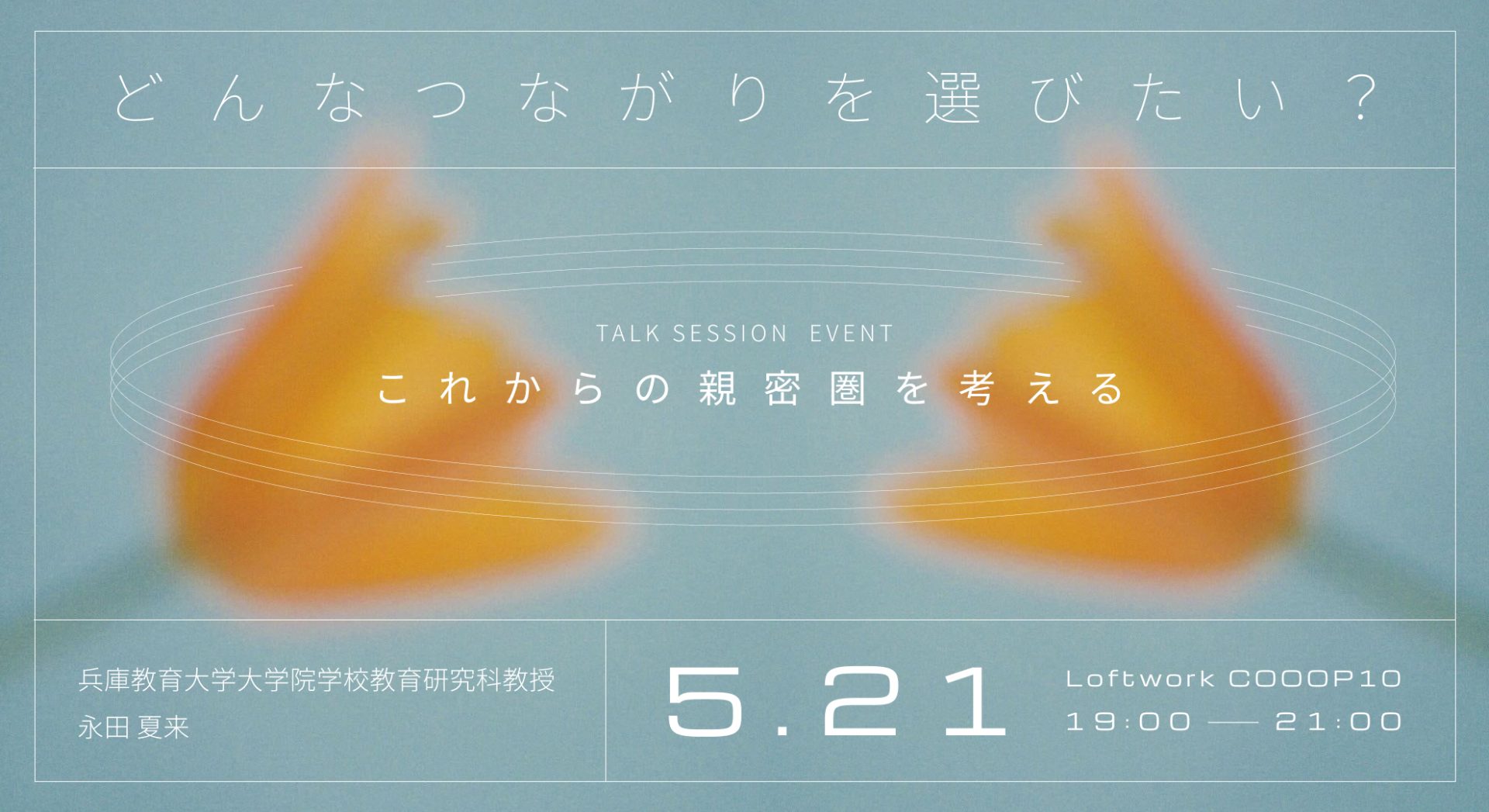 「家族でも恋人でもない親密なつながりを、私たちは意識的に選んで育てていけるのか?」をテーマに、家族社会学の研究者・永田夏来氏とともに現代の親密圏を考えるイベント。トークとワークショップで、自分らしい共同性のかたちを探します。2026年5月21日、渋谷Loftwork 10Fにて開催。