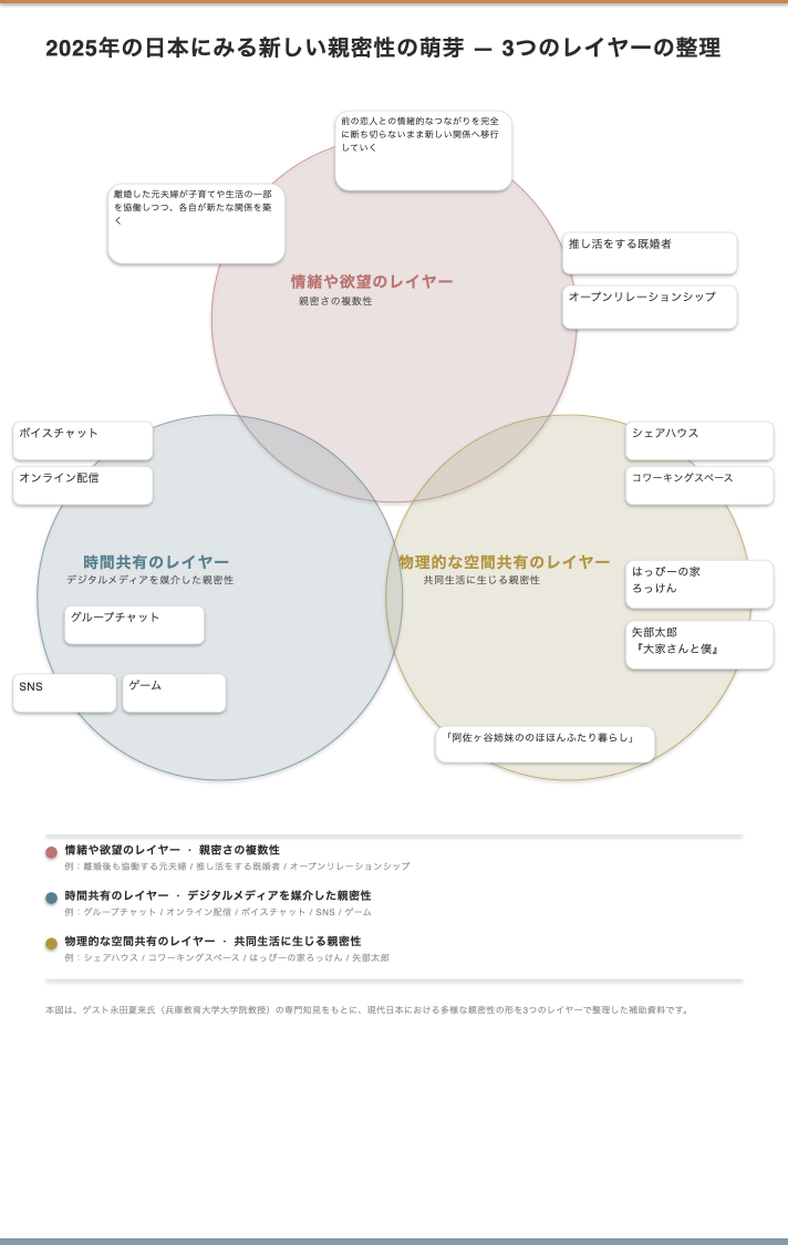 親密性の分散と家族制度の再編にて述べられている「親密圏3つのレイヤー」(本イベント企画者によるまとめ)