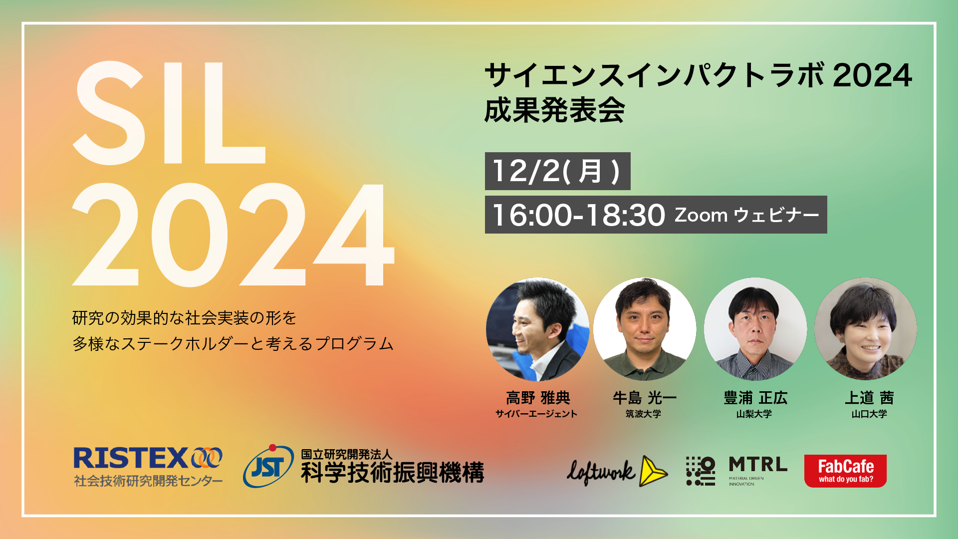 MTRL(運営:株式会社ロフトワーク)は、国立研究開発法人科学技術振興機構(JST)の社会技術研究開発センター(RISTEX)が行う共創プログラム、2024年度のサイエンスインパクトラボを運営しています。今回、3ヶ月間の共創活動の集大成として成果発表会を行うことが決定いたしました。成果発表会では、今年度のSILに参加した研究者の研究の社会実装プランを発表していただきます。今後の研究の社会実装の可能性について、みなさんで一緒に探ってみましょう。
