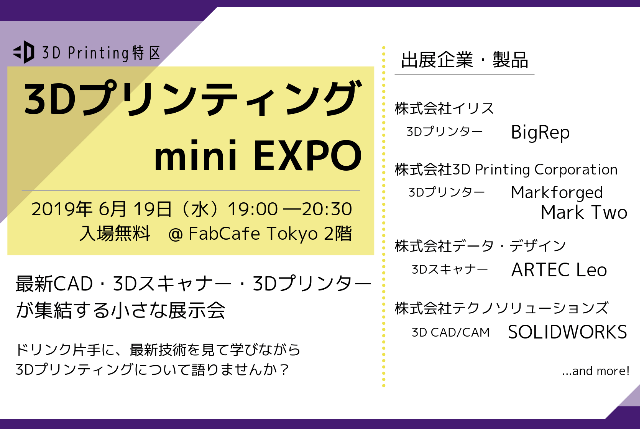 イベントにご参加いただく皆さまより、「もっと気軽に実際の製品やサンプルを見てみたい」というお声をよくいただきます。そこで、特別企画として、3Dプリンティングに関わる技術を集結させた「mini EXPO(小さな展示会)」を開催いたします!CAD、3Dスキャナー、3Dプリンターのデモ実演やサンプルを展示し、ものづくりソリューションをご紹介いたします。