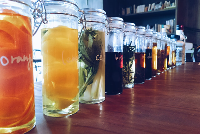 エルダーフラワー/アップルチップ/パクチー/どくだみ草/お屠蘇散/ジンチョウゲ/ラベンダー/ローズ/ホップ/ローズマリー/月桂樹の葉/生姜/山椒/キンモクセイ/ドリアン/カモミール/レモングラス/タイム/アンジェリカルーツなど、30種類のボタニカルなリキュールををご用意します。