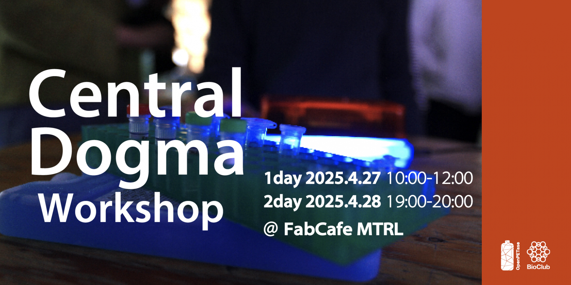 すべての生物はDNAに依存しています。 しかし、DNAはどのようにして生命を可能にしているのでしょうか? BioClubとOpenPETaseのワークショップにて、DNA、RNA、タンパク質のセントラルドグマについて学びましょう。 このハンズオンワークショップを通して、遺伝情報の流れがどのように可能なのかを肌で感じてください!