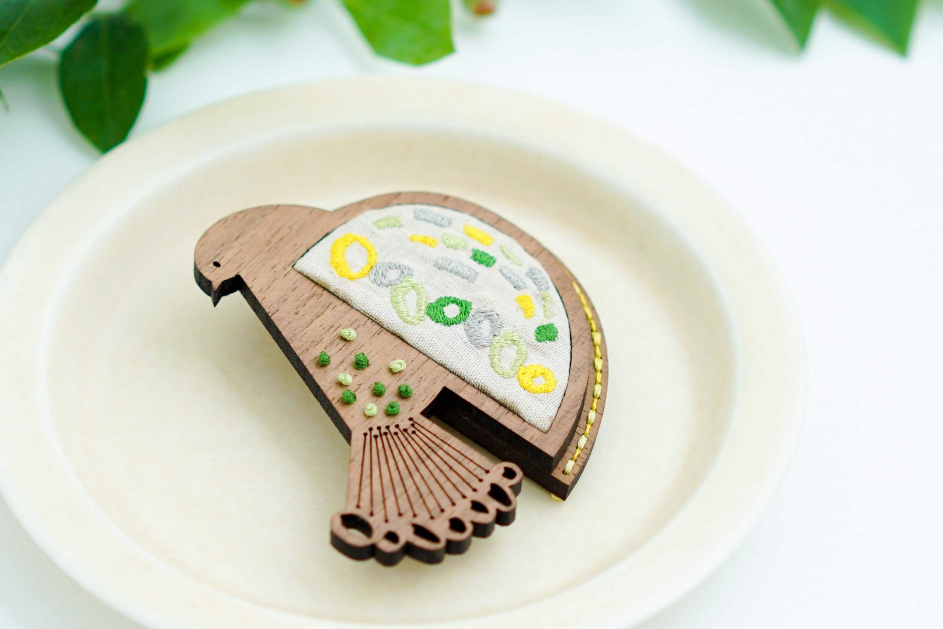 木と布の組み合わせがかわいい、小鳥のブローチ。