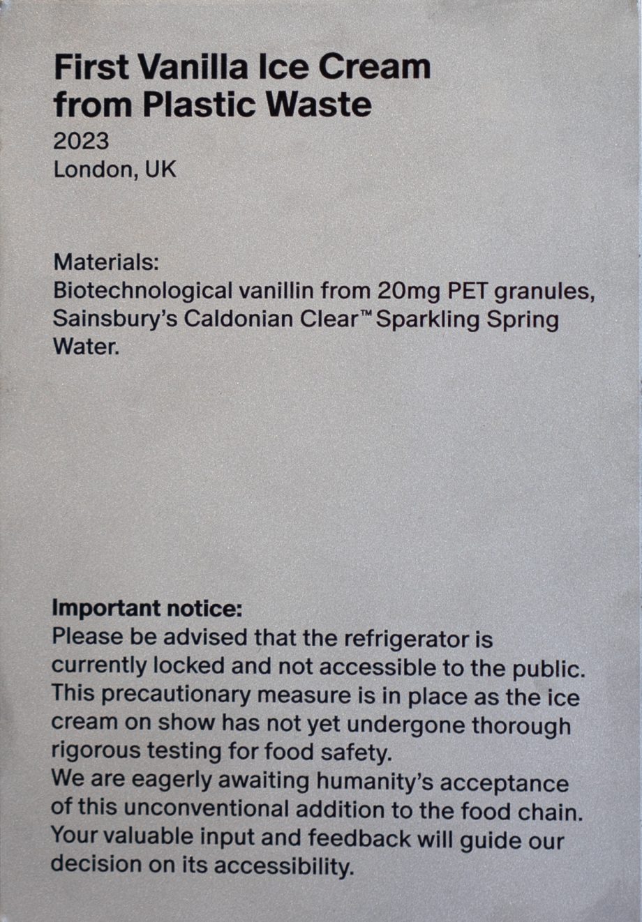 展示されているアイスクリームは、プラスチック廃棄物から作られた食品の初めての実際のサンプルです。20mgのPETプラスチックがアイスクリームの香りに使用されています。