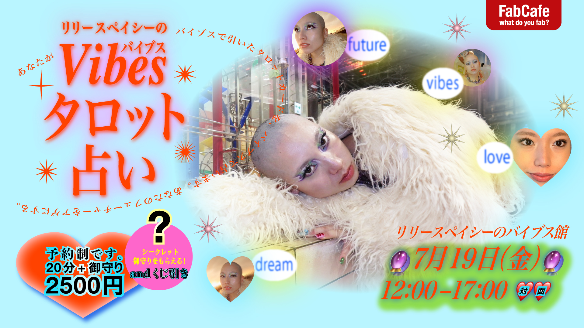 あなたがバイブスで引いたタロットカードを、バイブスで占います。あなたの人生がアゲていくためLily Spacey先生のエネルギーが入ったお札・Lily Spacey x FabCafe Tokyoのコラボグッズの御守りをお渡しします。