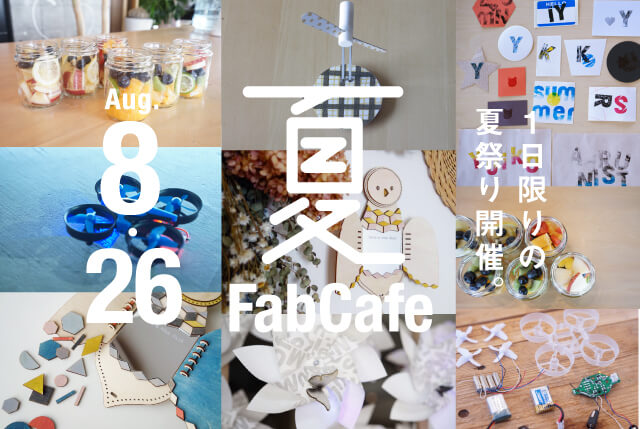 FabCafeでは、8月最後の日曜日に「夏祭り」を開催します。この日は、言ってみればFabCafeの夏フェス!FabCafeとFabCafe MTRLの2つのフロアで、6つのワークショップとクリエイターによる作品販売が行われます。ふらっと訪れてクリエイター作品との新しい出会いを体験するのもよし、1日中行われている、ワークショップをはしごしてみるのもおすすめです。