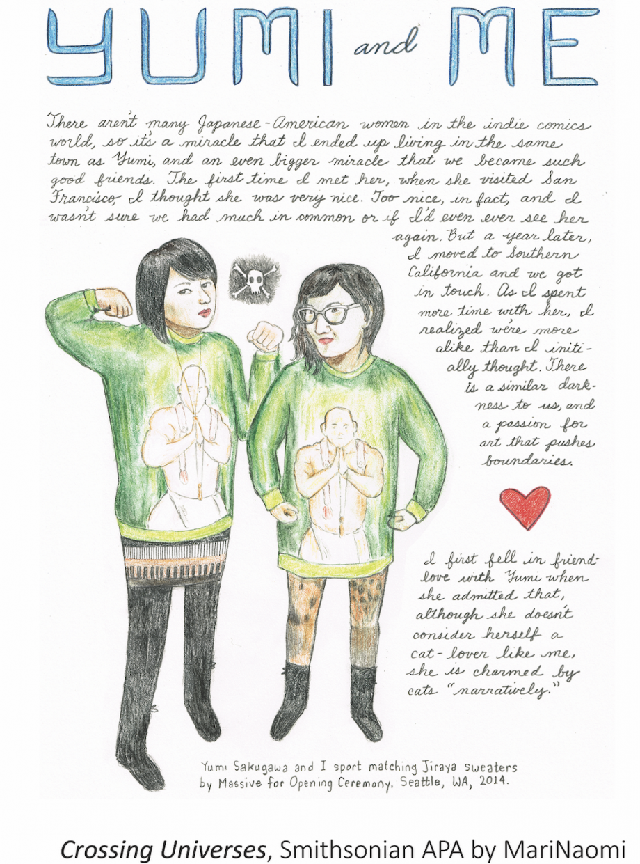 MariNaomi and Yumi Sakugawa are American visual storytellers who first met online in 2012. The nature of their work (experimental independent comics exploring their Japanese heritage) and shared struggles finding footing in a predominantly white, sexist industry strengthened their allyship. Shortly after meeting, Mari moved from San Francisco to Yumi’s Los Angeles, and they became friends in real life. They met regularly for work dates, gallery and museum outings, and hiking in the mountains, comparing their experiences, both professional and personal. They share love for tasty food, fashion photoshoots in the desert, and having adventures.