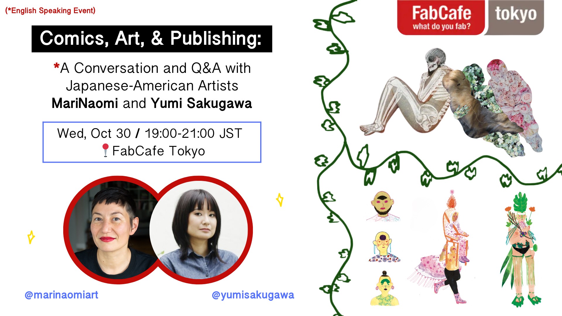 10月30日、FabCafe Tokyoで日系アメリカ人漫画家のYumi SakugawaさんとMariNaomiさんと一緒に、創作、出版、アートについて語り合い、同じ興味を持つ仲間と交流しませんか?また、10月25日から31日までの1週間、無料の展示も開催しますので、ぜひお立ち寄りください!
