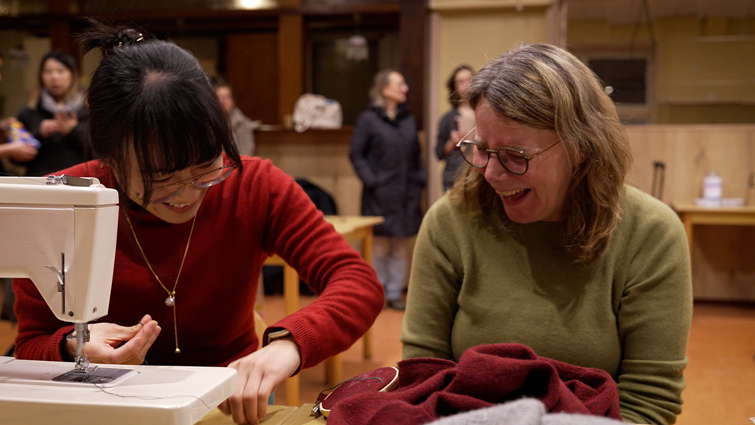 依頼者とボランティアが、一緒に洋服のリペアをしている – 映画『リペアカフェ』より(IDEAS FOR GOOD)