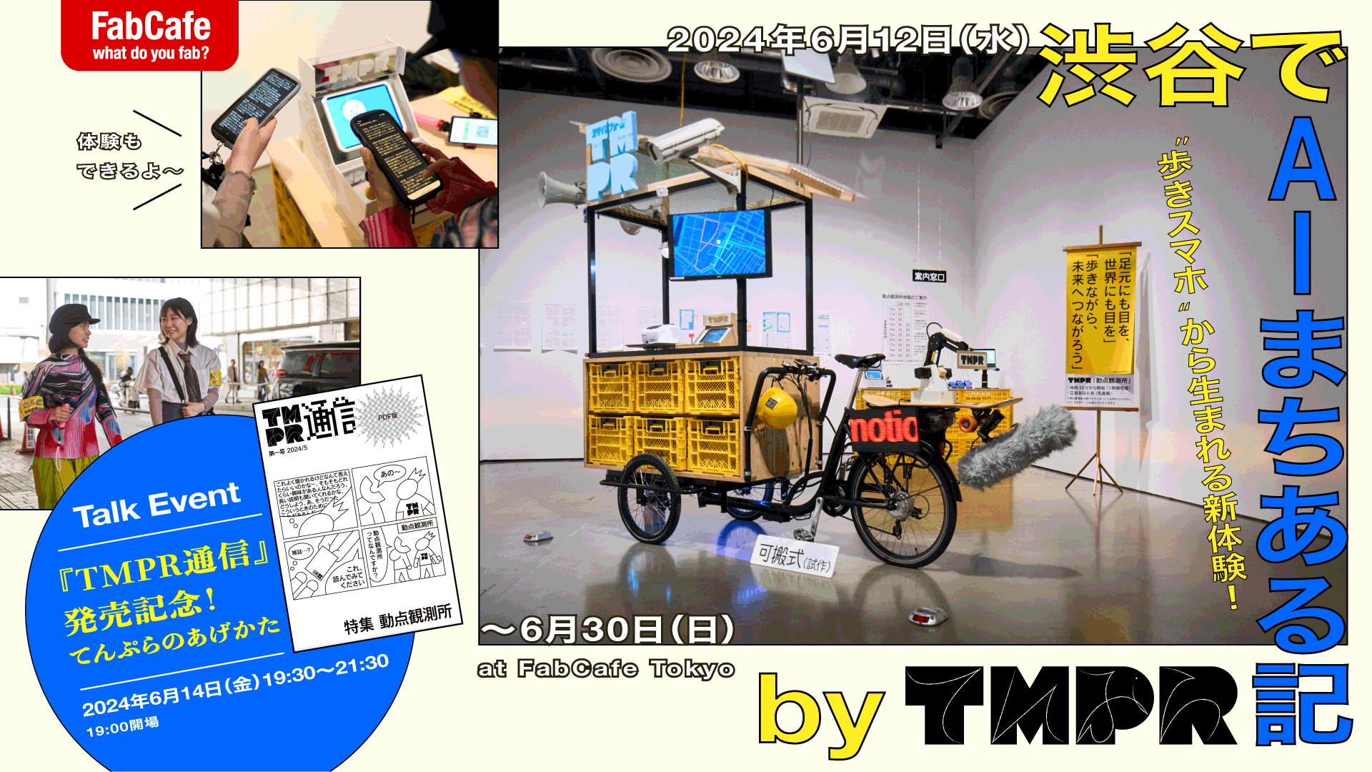 2023年度シビック・クリエイティブ・ベース東京 [CCBT] アーティスト・フェロー・プログラムで話題になったAIプロジェクトが、新バージョンでFabCafeに登場します。ユニークな屋台型展示のほか、「渋谷でAIまちある記」体験会も開催。プロジェクトの構想から実践までを収録したアーティストブック『TMPR通信 特集:動点観測所』も限定販売します! 新しいまち歩きのかたちや、技術と人間の関係、テクノロジーを活用した体験デザインに関心のある方はぜひこの機会をお見逃しなく。