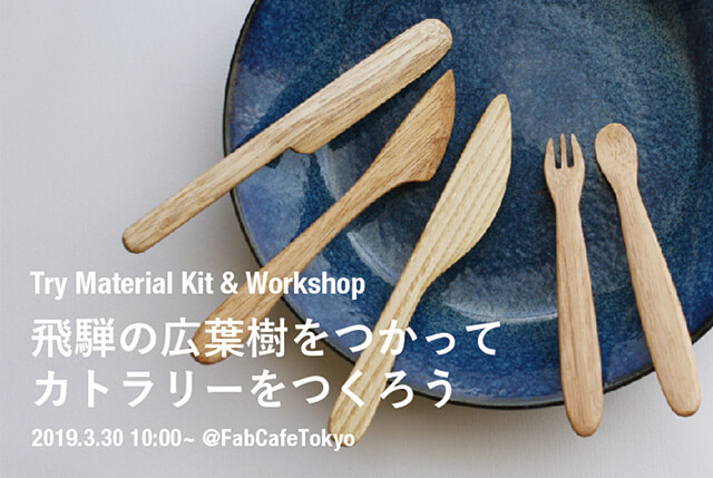 ものづくりのための様々な”素材”を持つ企業と一緒に、クリエイターやFabCafeに訪れる人に「素材のサンプルキット」として、少量で実験的に使う事ができるキットの販売をしています。現在販売しているのは、ブラックライトで光る塗料の「サンルミシスインキ」や、石膏のような造形素材「ジェスモナイト」、キラキラと輝くアルミニウム顔料の「クロマシャイン」などなど、ジャンルも様々なものばかり。今回はその仲間に、新たに飛騨の木材から生まれたカトラリーのキットが加わりました!