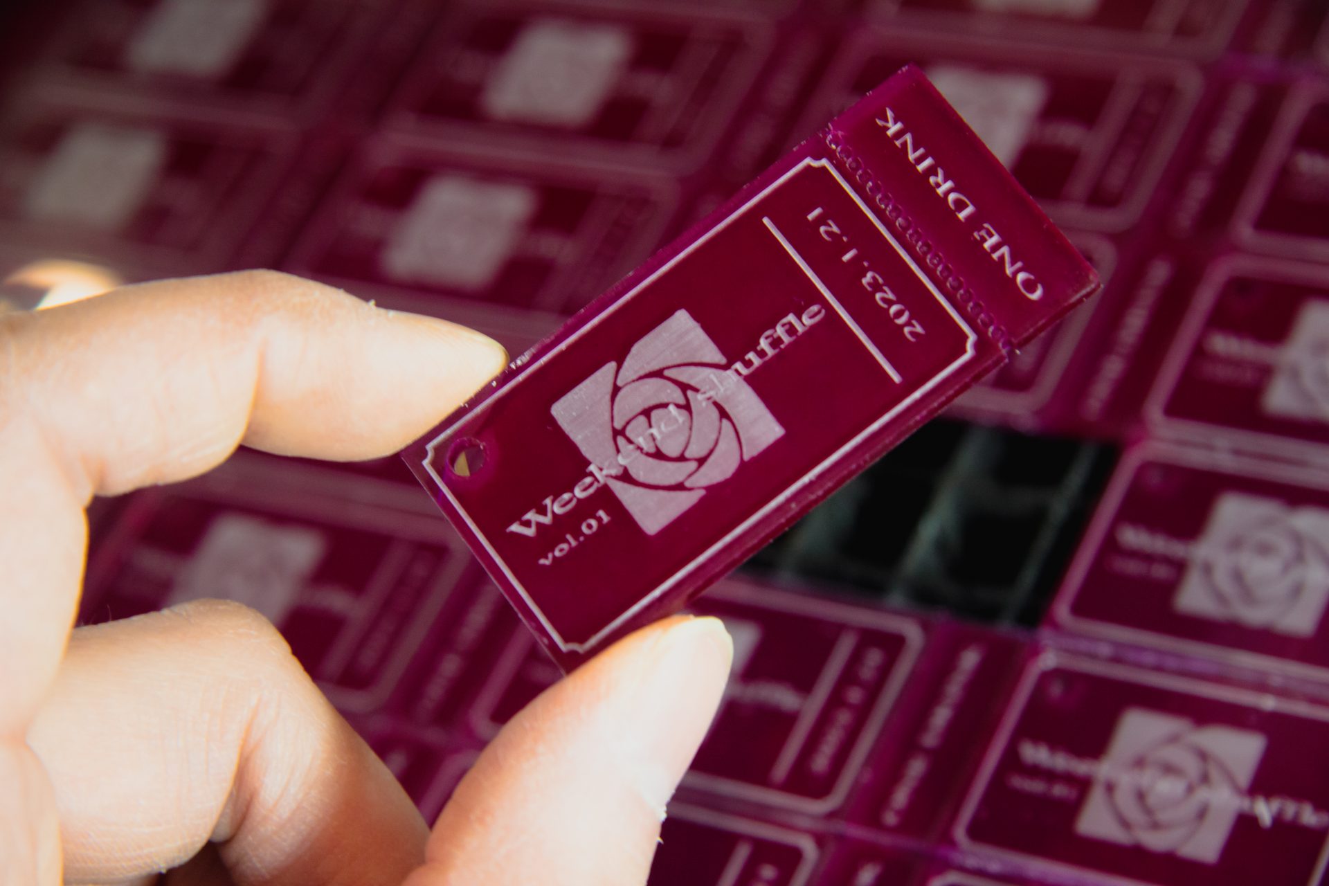 アクリルを使い切り離せるキーチャームドリンクチケットを作成し”パキっ”と折れる仕様に。本体側はお客様にお渡しします。3mm径の穴を開けているのでお好みのボールチェーンやワイヤーに通してお楽しみいただけます。ぜひコレクションしてください!