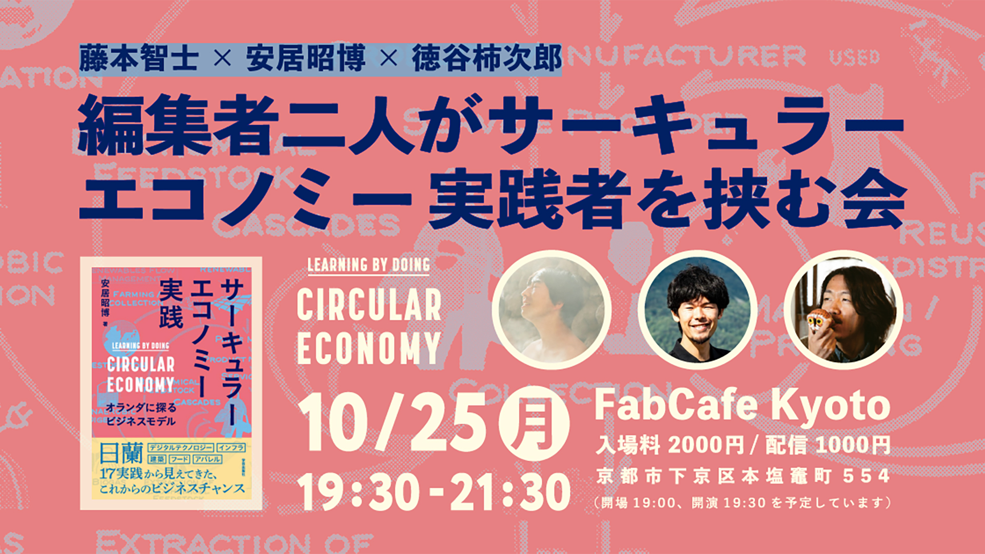 今回はその柿次郎さんが「この道の大先輩!」と慕う編集者・藤本智士さんもゲストにお招きし、編集者二人が安居さんを挟みながら、「サーキュラーエコノミーの実践をローカルにどう落としこんでいけるのか?」、じわじわ深掘りしていきます。