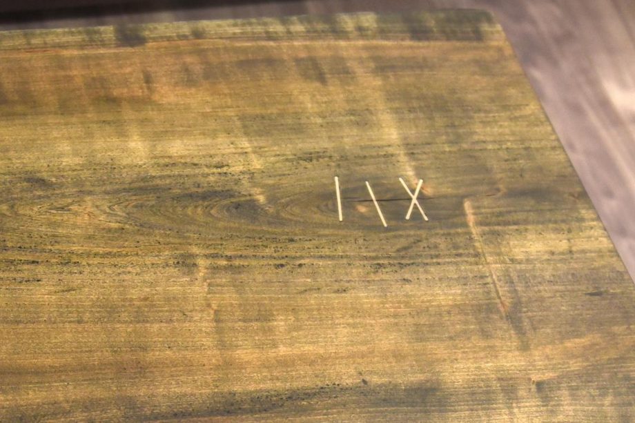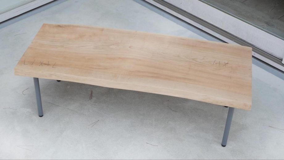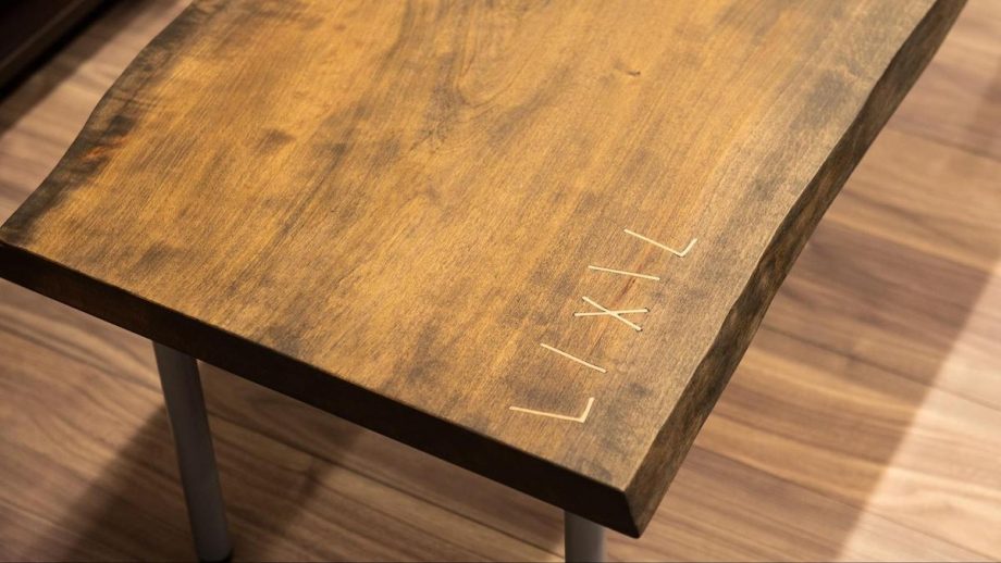 割れが大きく進みすぎないように、ちぎりや鎹(かすがい)を入れる木の動きに合わせた手法があります。ローテーブルの製作では、割れを「防ぐ」処理として使用される鎹の形状に遊び心を加え、”L””I””X”の形の鎹を製作。鎹自体を「魅せる」ことで、割れという通常家具などでは製品として用いられないネガティブな要素をポジティブに変えるデザインとしました。