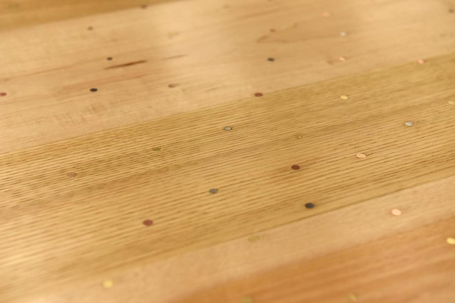 4種の金属が全て埋まった天板は、光の当たると金棒が星屑のように繊細な表情を見せてくれます。反対に影が当たるとコントラストが逆転し、木の色味を引き立たせます。