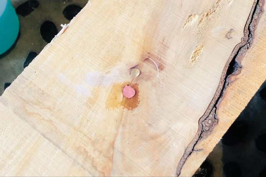 素材の掛け合わせによる見え方が樹種や金属質の違いでどのように変わるのか。木に真鍮と銅を打ち込み相性を見ていきます。