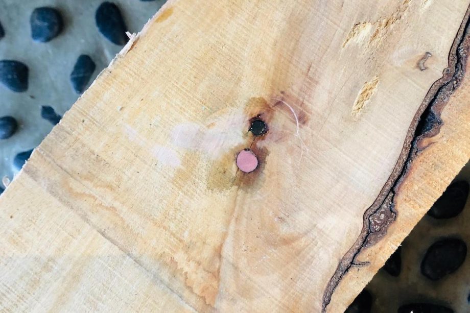 真鍮(金色)と銅(ピンク色)を打ち込んだ木