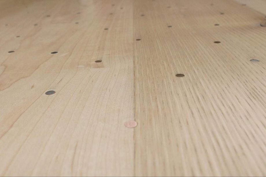 天板に金物を打ち込んでいるタイミングで、広葉樹の剥ぎ合わせ天板を製作してくれた家具職人の堅田さんが覗きに来てくれました。今回使用した広葉樹の性質や特徴、木材加工の道具についてアドバイスをもらいながら製作を進めて行きます。