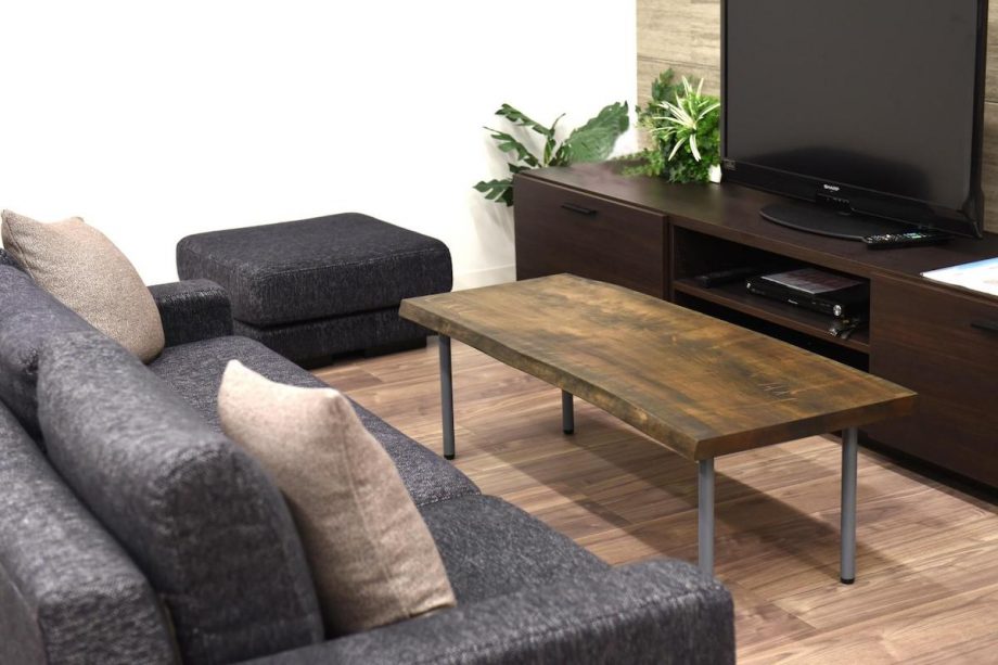 テーブルの耳はそのままにすることで、有機的なフォルムの中に、鎹の直線が映えて上質な印象を与えます。仕上げには設置するスペースの色調に合わせて、ブラックに近い色味のオイル塗装を施しました。これにより空間に馴染むだけでなく、木と鎹のコントラストが明確になり、各素材の存在感が引き立つテーブルとなっています。