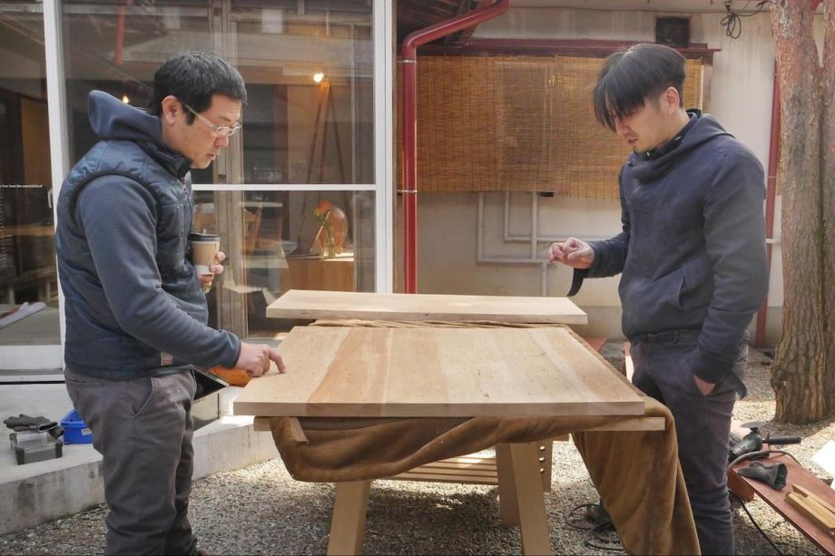 FabCafe Hidaの中庭で堅田さんと上田さんが木の特徴やそれに合わせた加工方法・道具の調整など、その場で新しいやり方や道具を試行錯誤していくライブ感はとても頼もしかったです。今回のテーブルだけでは無く、継続してこういった実験的なものづくりにチャレンジしていきたい思いました。